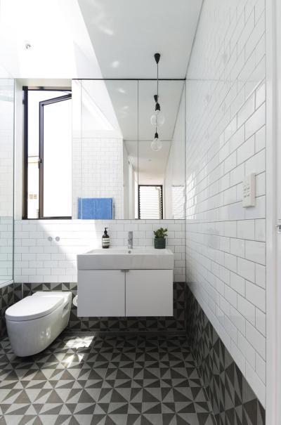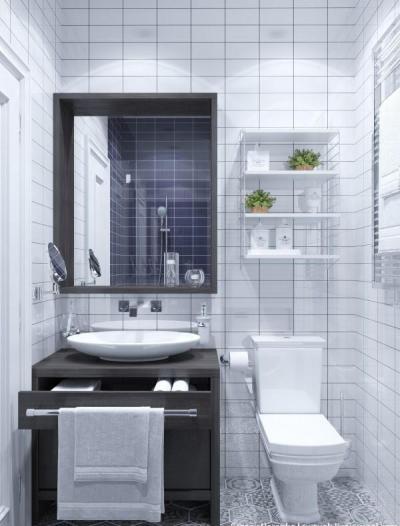 Metrócsempe és cementlap burkolat a fürdőben