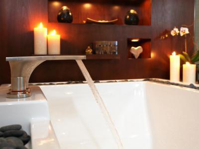 Szabadon álló kád és csap a fürdőben