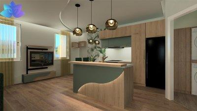 Modern kis ház nappali étkező-konyha mozgatható tv tartóval