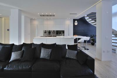 Fekete fehér színvilág a konyha-nappaliban