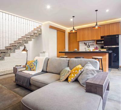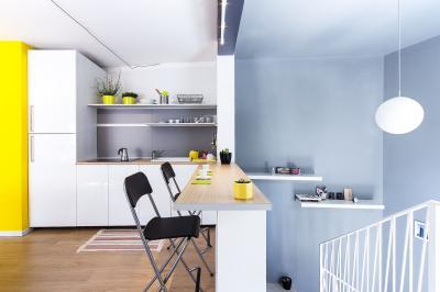 Kis lakás galériával, lépcső alatti konyhával