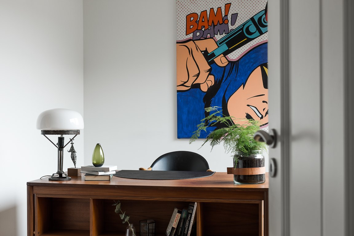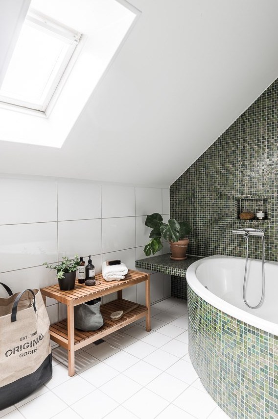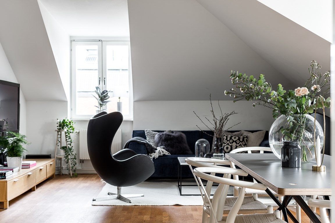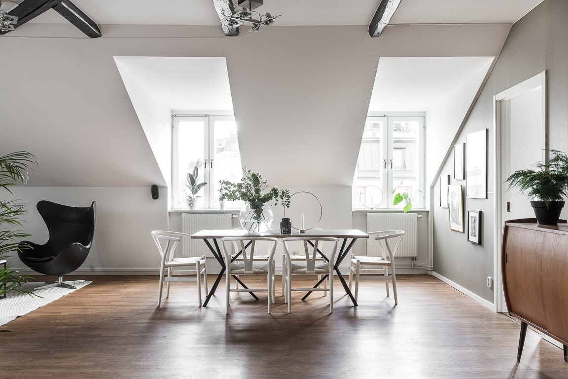 Nem hátrány a sok ferde síkú fal sem ebben a lakásban. Főként világos színek a falakon, illetve megjelenik a melegszürke is a falon és kiegészítőkben. A konyha egyik leszebb eleme a klasszikus étkezőasztal, melyhez modern műanyag székeket társítottak. Az erkély pici, de annál édesebb. A reggeli kávé sehol sem eshet oly jól, mint itt.