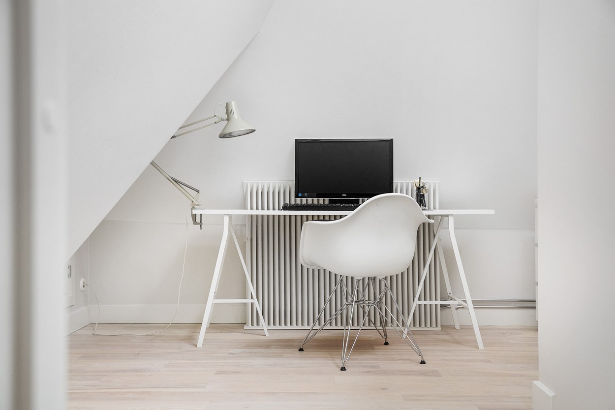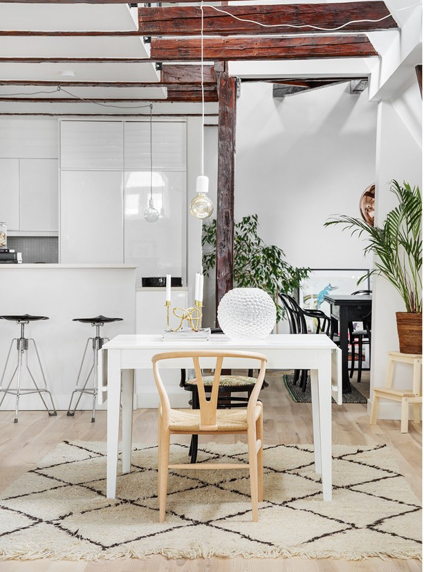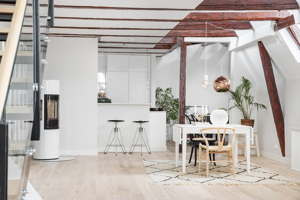 A ház, ahol ez az igencsak látványos lakás található, a 19. században épült Malmöben. Eredetileg a lakás fölött már csak a padlás volt, amit ügyes tervezéssel és átépítéssel idecsatoltak. A korabeli ablakmélyedések, a látszógerendák látványelemként jelennek meg az enteriőrökben. A stílus alapvetően modern és tagadthatatlanul skandináv, melyhez jól illenek az ipari jellegű kiegészítők. A padlástérhez sikerült egy apró kis tetőteraszt is kialakítani, mely - ha esik, ha fúj - a lakók kedvenc tartózkodási helye.