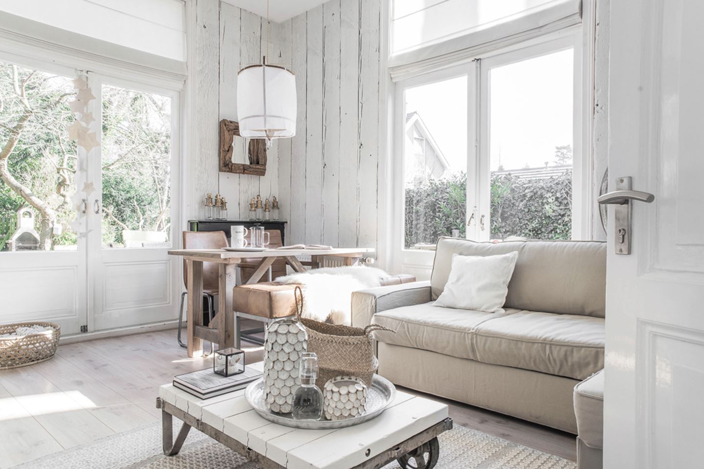 A konyha letisztult minimál stílusa mellett egy shabby chic étkezőasztal található kárpitozott fotelekkel. A faburkolatú zárt, fedett teraszon tengerparti nyaralóban érezhetjük magunkat. A ház nappalija is eklektikus képet mutat, modern kanapéval, régi hajókofferrel és a barokkosan túláradó csillárral. Mindezt fekete-fehér-szürke alapokra helyezve.