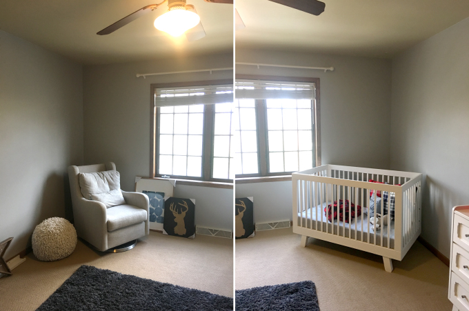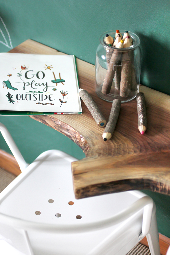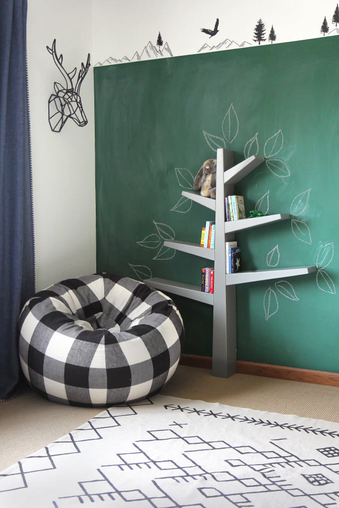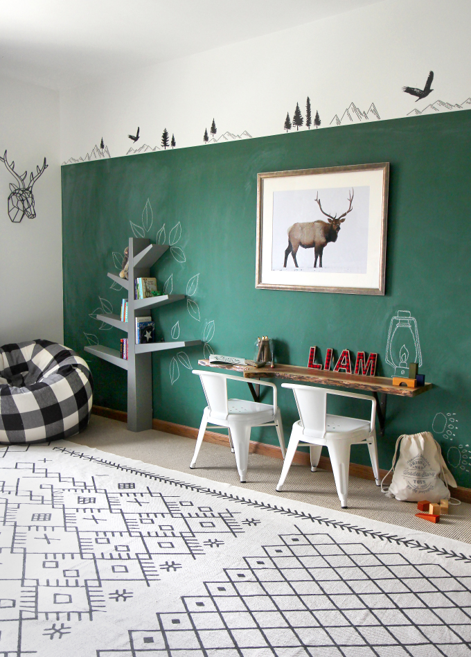 Egy gyerekszoba előtte-utána képei. A valamikori babaszobát átalakították a nagyobbacska gyerek számára. Egy teljes fal kapott a zöld táblafestékből, így elég hely áll rendelkezésre az alkotáshoz, rajzoláshoz. S még a fát imitáló könyvespolc leveleit is felrajzolhatták.