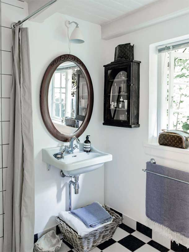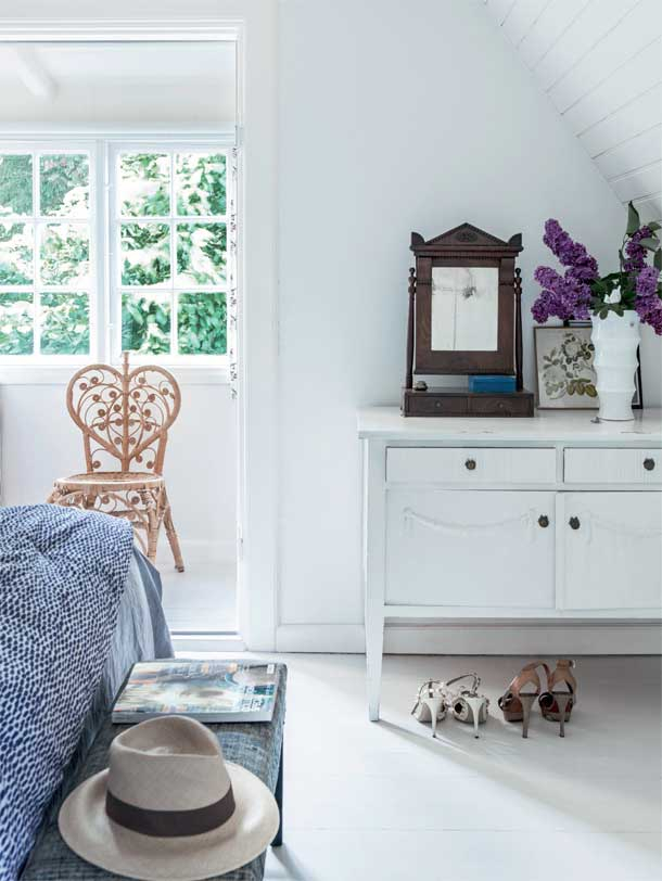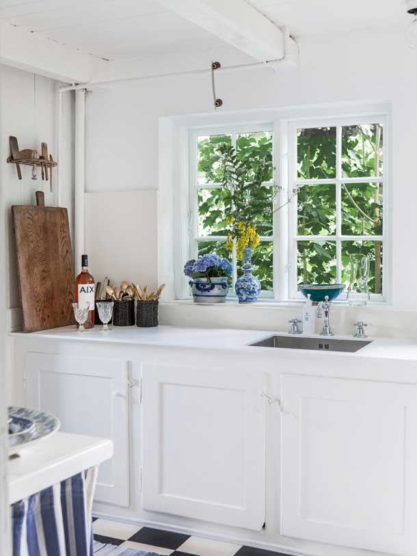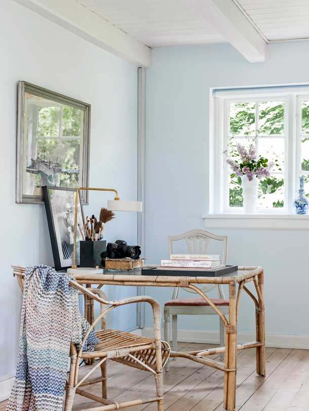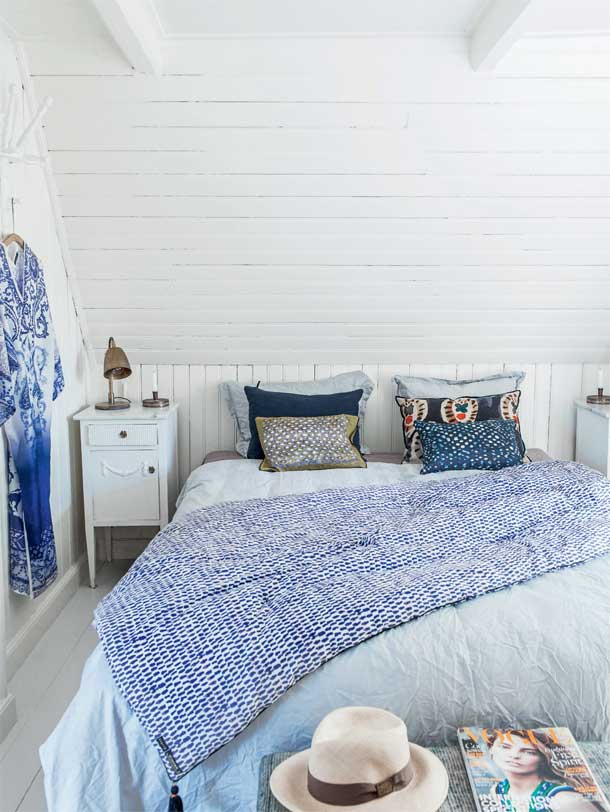 Megnyugtató, hűs kékeket használtak a házban, kivéve persze ahol fehérre festett a fa falburkolat. Kedves kis otthon, vidékies hangulat. Természetes anyagok és bútorok szolgálják az itt élők kényelmét.