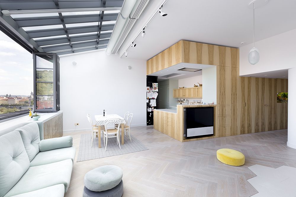 Prágában található ez a várra kilátással rendelkező loft lakás, amelynek kialakításában a tervezők két szempontot vettek figyelembe: a kilátást és a tulajdonosok nemes kövek iránti szeretetét. Ahhoz, hogy a nappali zónában teljes egészében élvezzék a kilátást, téli kerthez hasonlóan tetőablakok és harmonika szerűen nyitható ablakok adják a megoldást, míg a nemes kövek, mint az állandóság szimbólumai, elegáns és egyedi dekorációi az enteriőrnek. A modern stílusú otthon egyedi tervezésű, elegáns elemekben is gazdag: ívelt falak és bútorok, szokatlan padlóburkolat találkozás, szép radiátortakaró, fürdőszobai élő növényfal és még sok más. További ötletekért érdemes az összes képet alaposan végig nézni!