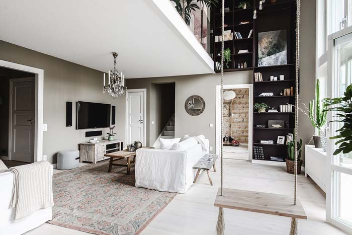 Nem titkolom, ez a pazar lakás nagyon a hatása alá vont. Egyébként is gyengém az eklektika. A hinta a nappaliban, szuper, infantilis, de épp ez kell! A galérián egy második, mini-nappali kapott helyet. A fent és lent összekapcsolódik a sötétbarna polcrendszernek köszönhetően.