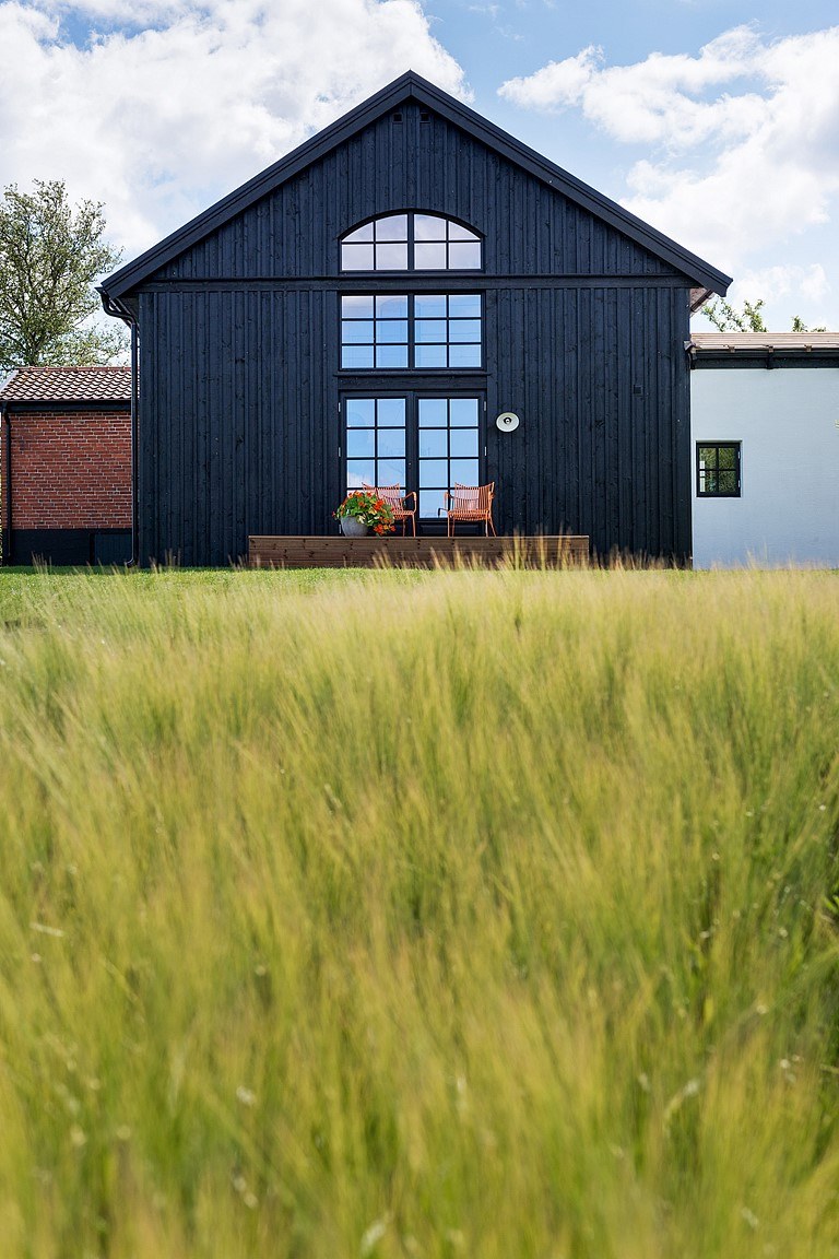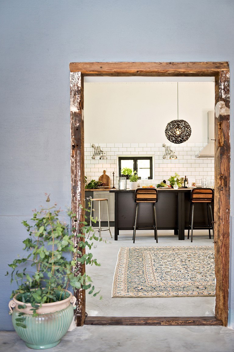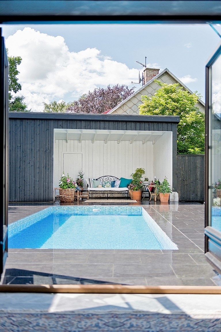 Igazán mesés ez a medencés, tágas családi ház. Hatalmas a konyha, többféle világítótesttel, mert a főzés itt fontos, s ehhez megfelelő megvilágítás dukál. A stílus eklektikus, rusztikus és indusztriál elemek keverednek szépen egymással. Farmerkék falú vagány nappali, ahol stílusosan az egyik lábzsámoly is farmerral kárpitozott. Az egyik fürdő csempéi is ehhez a színhez közeliek, a hófehér szanitereknek kiváló hátteret nyújt.