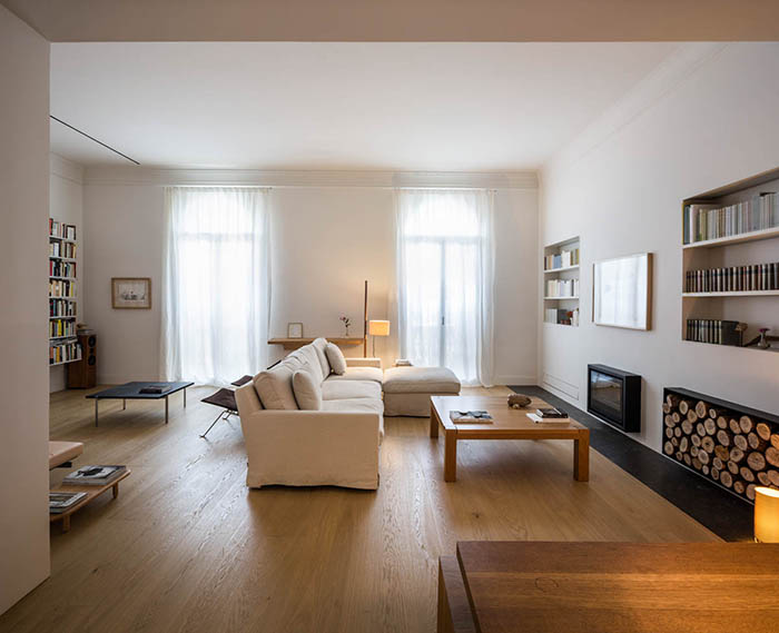 Szögletes geometriai formákkal és okos, praktikus térszervezéssel alakították ezt a duplex jellegű barcelonai otthont Francesc Rifé Stúdió építészei. A lakás kialakításánál a fő céljuk az volt, hogy az otthon tükrözze a tulajdonosok személyiségét és életmódját, ezért az enteriőrben a könyvek, a természetes anyagok, a fehér és a tölgyfa felületek játszák a fő szerepet, illetve minden belső tere fürdik a fényben. A maximális tér kihasználtságát elegáns módon szinte minimál egyszerűséggel, beépített bútorokkal, lengő lépcsőfokok és üvegfal kombinációjával, gipszkarton segítségével falba süllyesztett polcok kialakításával oldották meg.