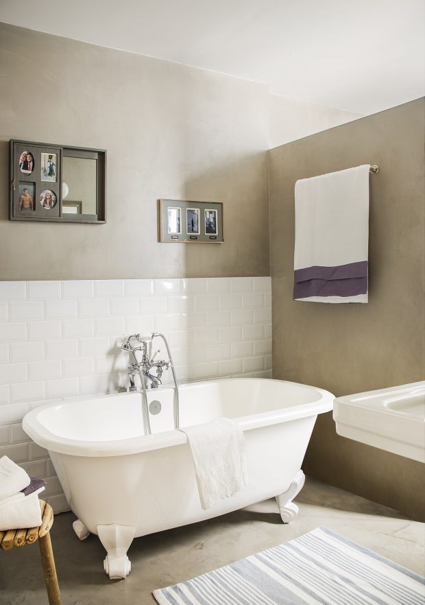 A kellemes déli hangulat mellett megfigyelhető pici indusztriál és skandi lenyomat is ebben a spanyol családi házban. A fürdőszoba egészen egyszerű, szinte puritán. De nem úgy a konyha-étkező-nappali. A nappalit uralja a hatalmas és kényelmes fehér kanapé és a szép asztal. Az asztal fém lábai összehangban vannak a fémkeretes, üveg térelválasztó fallal.