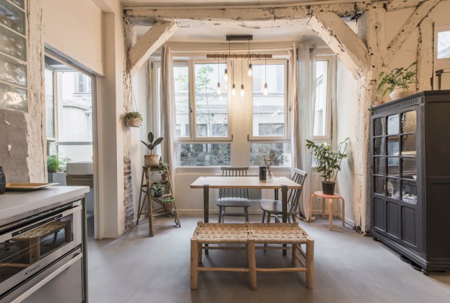 Minden belefért, amire szüksége lehet, ebbe a picike loft-lakásba. A háló, mint ilyen esetben oly gyakran, egy galérián kapott helyet. Az üvegtéglák elegendő fény engednek át oda. A galéria alatt nagy szekrény található, ami elnyeli a ruhákat, cipőket. Sőt, még a dolgozósarok is teret kapott itt. Nyerbeton padló, némi tégla és sok, kopott, fehér látszógerenda természetesen nem maradhat el a loftos hatás érdekében.