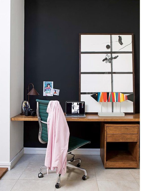 Ez a lakás igazán laza és eredeti, sok jópofa részlettel. Az étkezőt határoló könyvespolc rögzítőváza és az ott található létra, mely újságtartóként funkcionál. A feketére festett falszakaszok, nem csak a felfelé vezető lépcső mellett jelennek meg, hanem a dolgozószobában is. A nappaliban hanyagolták a TV-t, a kanapéval szemközt egy nagy tükör dől hanyagul a falnak.