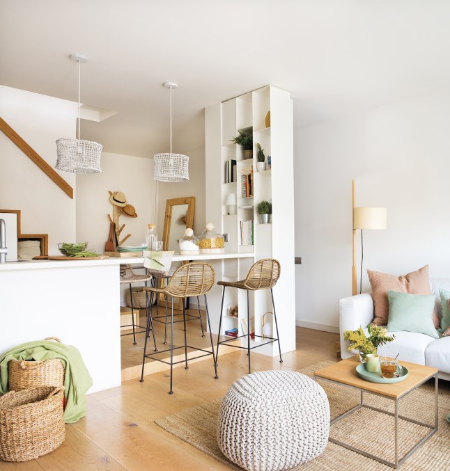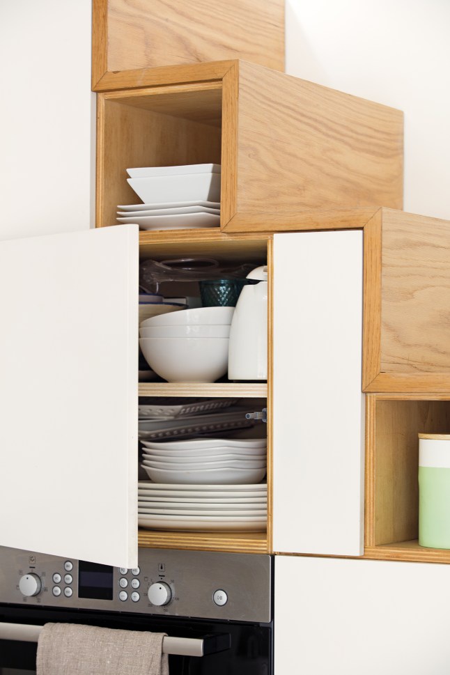 Ilyen kis alapterületen mindent pontosan meg kell tervezni. Földszinten nappali-étkező-konyha kombinálása, emeleten hálószoba és fürdő. Hatalmas ablakok és a természetes fény segített optikailag nagyobbítani a teret. Legfontosabb az egyedi bútorok, rejtett szekrények, lépcső alatti polcok, térelválasztók kitalálása, elkészítése  volt.