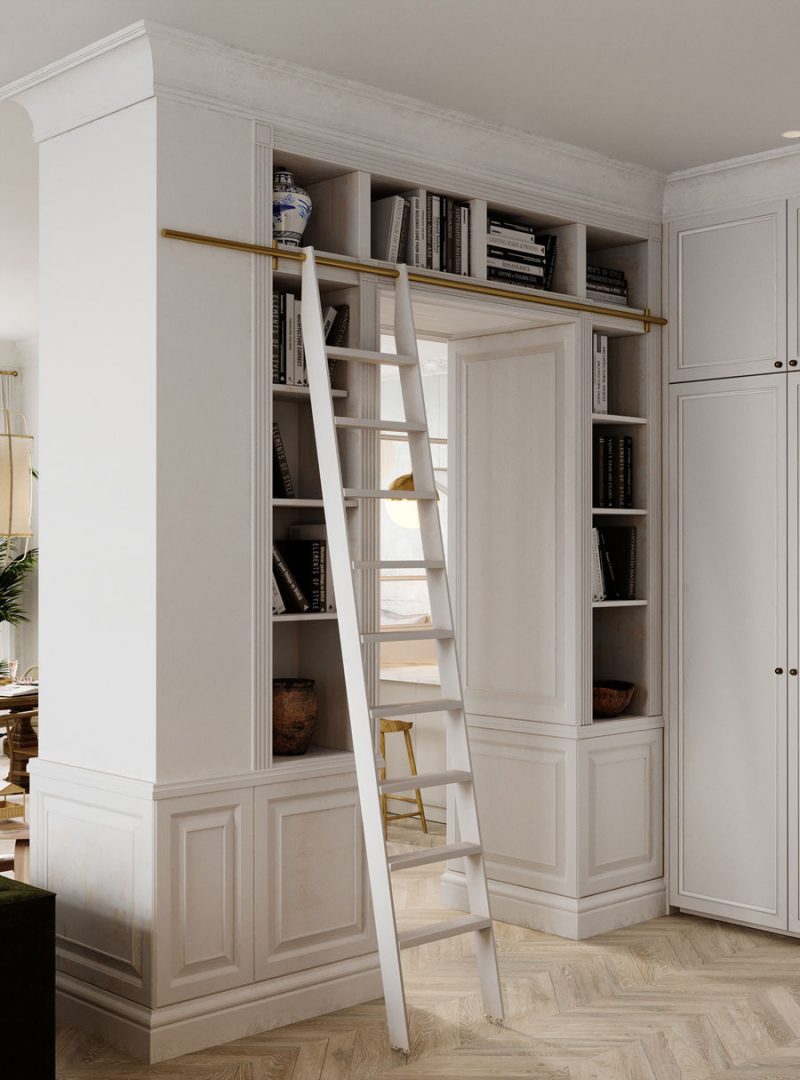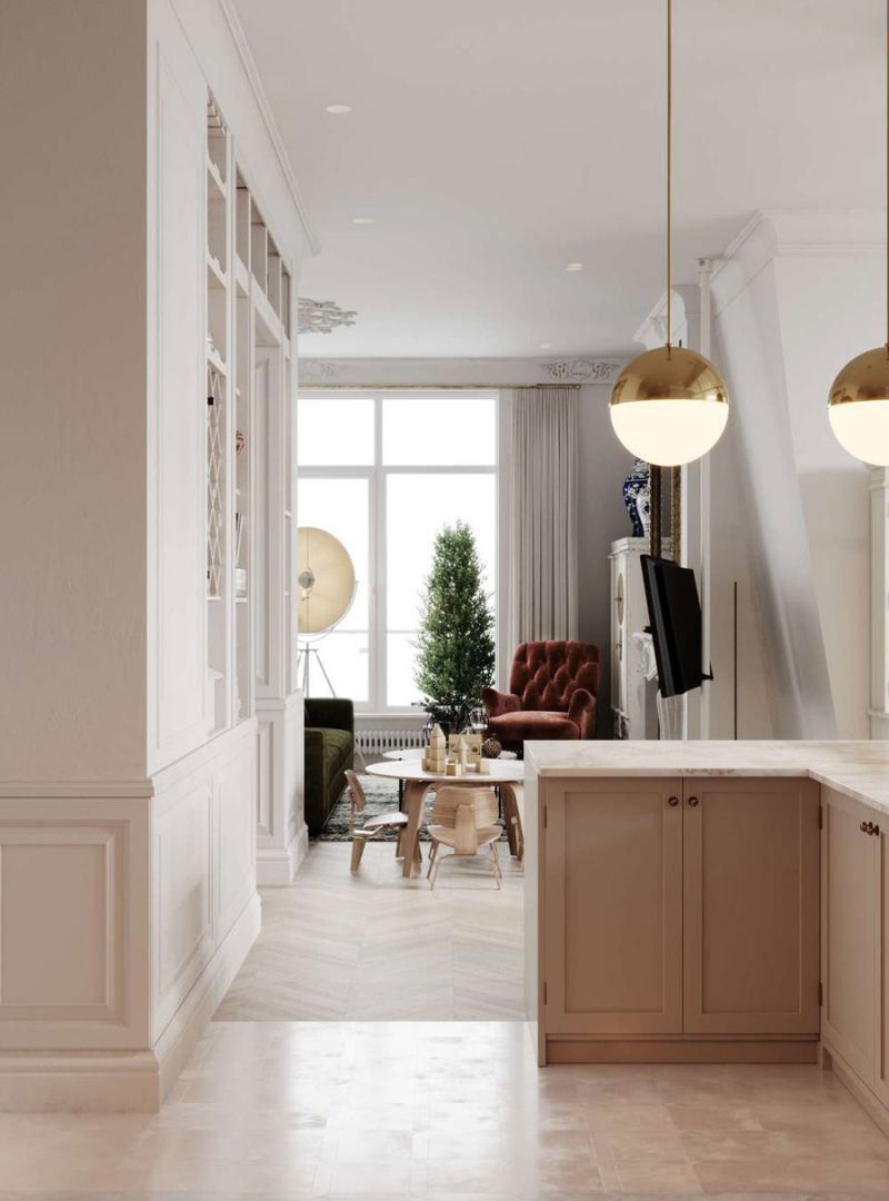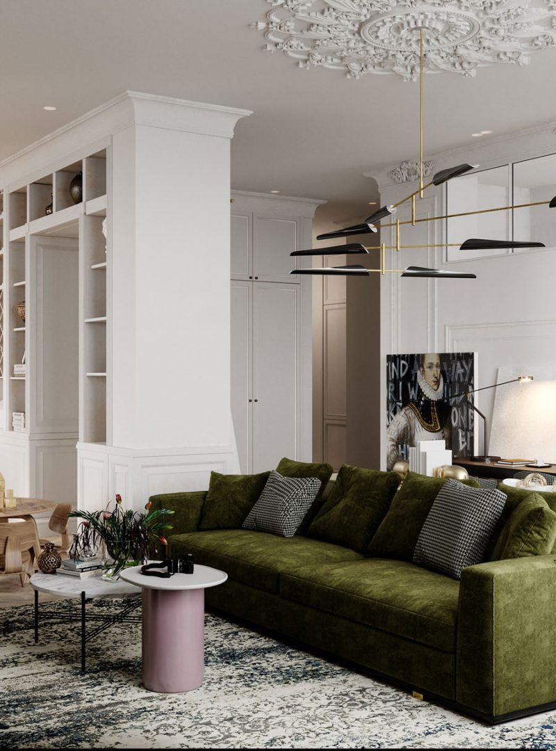 Az elegáns brit stílus egyértelműen felismerhető. Mindenhol klasszikus jellegzetes részleteivel, mint például a dísztárgyak és rozetta mennyezet, szegélyek a falakon, a nappaliban egy nagyon szép nagy szekrény, saját gardrób. Az egész lakásban gyönyörű halszálkás fapadló található, amely tökéletesen illik a kívánt hangulathoz. Ugyancsak helyénvaló bútorokat és kiegészítőket választottak a bársonyos zöld kanapé a nappaliban, vidéki stílusú, fából készült asztal körül a mix székek. Az arany és márvány díszítés visszatérő mindenhol.