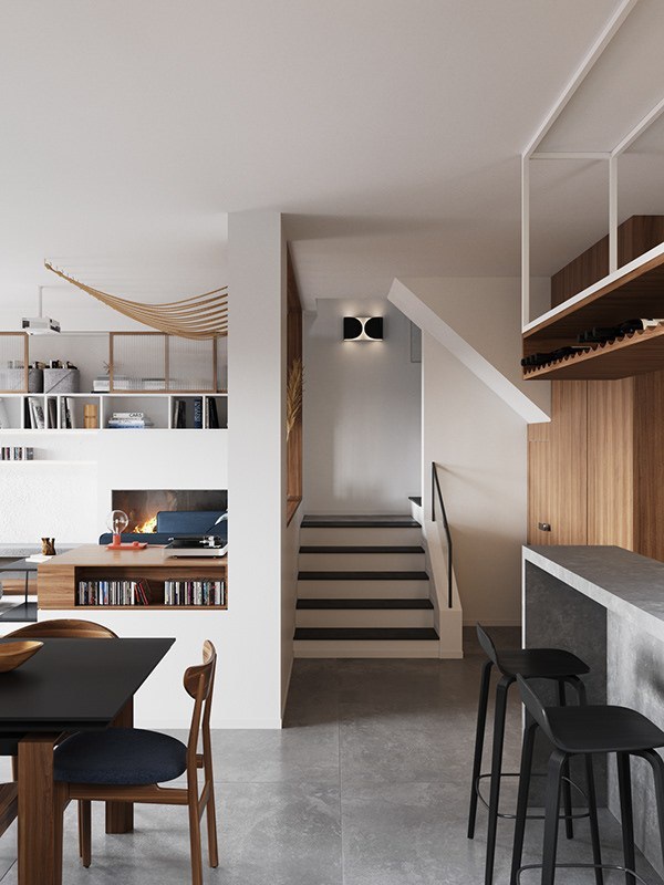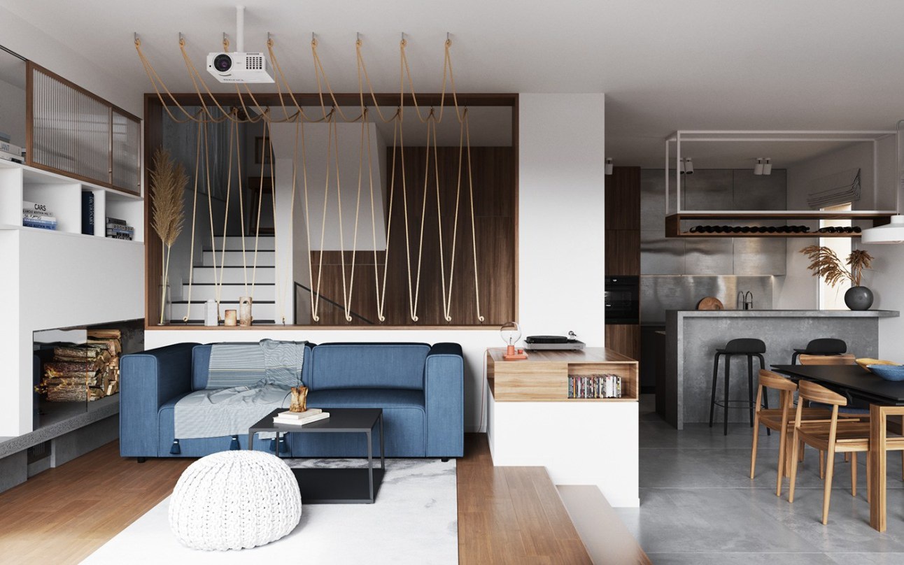 A 112m²-es lakásba lépve egy nagy térbe érkezünk, ahol ügyesen vannak szeparálva a funkciók. Az előszoba és a nappali között térelválasztóként hajó kötél van kifeszítve, ami a tulajdonosok "ház a tónál" koncepcióját erősíti. A másik szuper elválasztó megoldás a nappali szint eltolása. Itt az ügyes burkolat váltást is érdemes megfigyelni. A víz koncepciót erősíti a kanapé kékje, a kandalló pedig növeli a komfortérzetet. Tv helyett projektort választottak, amit az ablak elé feszített vászonnal tudnak használni. Jó megoldás abban az esetben ha keveset tv-zünk és nincs olyan falunk, ami alkalmas lenne a tv elhelyezésére. A reggeliző pult felett helyes kis bortárolót alakítottak ki, ami még jobb lett volna ha plusz világítást is kap.