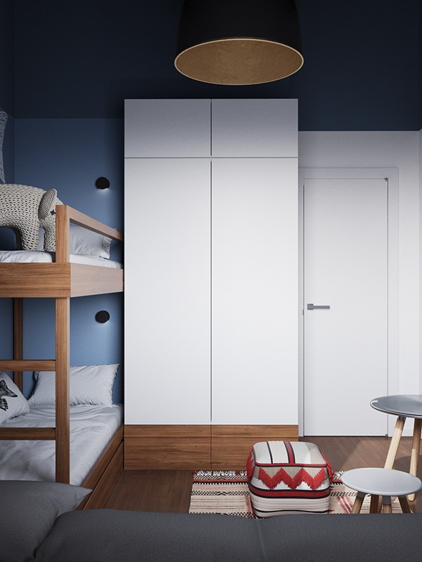 Az emeleten találhatóak a hálószobák és a fürdő. A szülői hálóban a gardróbbal egybeépített fésülködő asztal remekül használja ki a sarkot. A másik oldalon pedig fa falpanel kapott helyett, amelyek együtt nagyon szépen keretezik a szobát. A gyerekszobában jelenik meg leginkább a vizes hatás, a színek és falfestés által.
