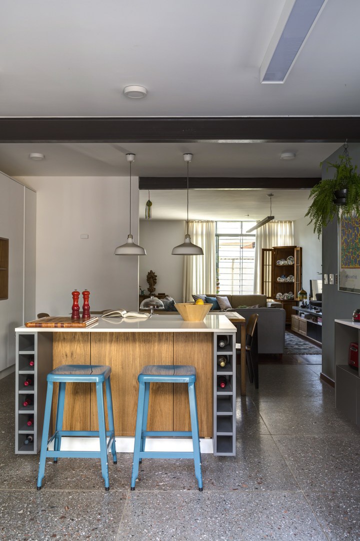 Egy modern nagy lakás átalakításánál döntöttek úgy a tervezők, hogy egybe nyitják a konyha-étkezőt, sőt egy átjáróval a nappali felé is nyitott lesz, ezáltal átlátható, nagy teret kaptak.