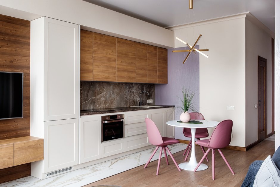 Mesterien alakították át ezt a tágas stúdiót: egy egyszerű függönnyel külön hálószobát hoztak létre benne. A függöny itt nemcsak vizuális határ, hanem atmoszférateremtő elem is. Az átalakítás megőrizte a nyitottság érzetét, mégis intimitást adott a hálórésznek. Az előszobában helyet kapott egy kényelmes gardrób, amely rendezettséget és praktikumot biztosít. A falakra a Farrow & Ball lila színpalettájából válogatott árnyalatok kerültek, amelyek otthonossá és hívogatóvá teszik a teret. A finom színek és puha textíliák harmóniája tökéletesen kiegyensúlyozza a funkciót és a stílust.