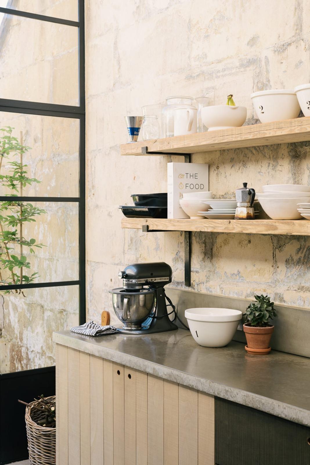 Elegáns, ipari stílusú konyhát terveztek ebbe a modern lakásba a lakberendezők. Konyhaszigettel és nyitott polcos tárolással készült. Az üvegtető alatt, a felvillanó lombkorona árnyékában úgy néz ki, mint egy meleg téli kert: gyönyörű, praktikus és biztos, hogy teljesen egyedi megoldás.