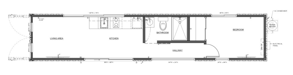 A modell egy 40 láb hosszú tengeri konténer átalakításának eredménye, és magában foglal egy hálószobát, egy fürdőszobát, egy nappalit és egy konyhát. Az USA-ban teherautóval teljesen felszerelt formában szállítják a vevő által választott telekre. A képeken viszonylag drága, magas minőségű kivitelben és berendezéssel látjuk, ezt biztosan ki lehet hozni kevesebből is. (Igy ahogy látjuk, ez telepitve 98 ezer dollár...) A cikk végén található terv ötletet adhat akár egy saját változathoz is!