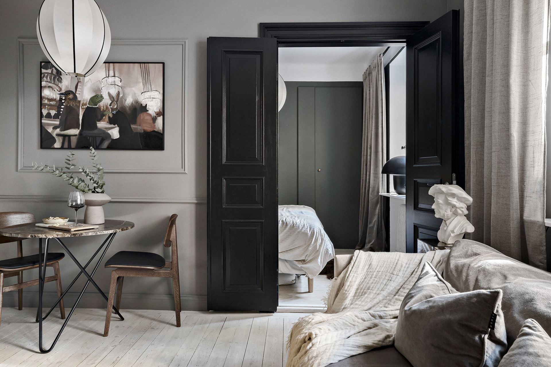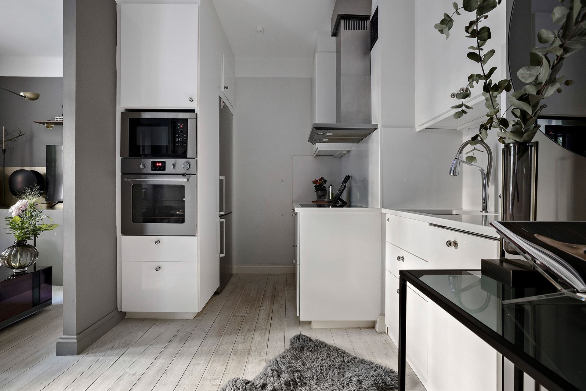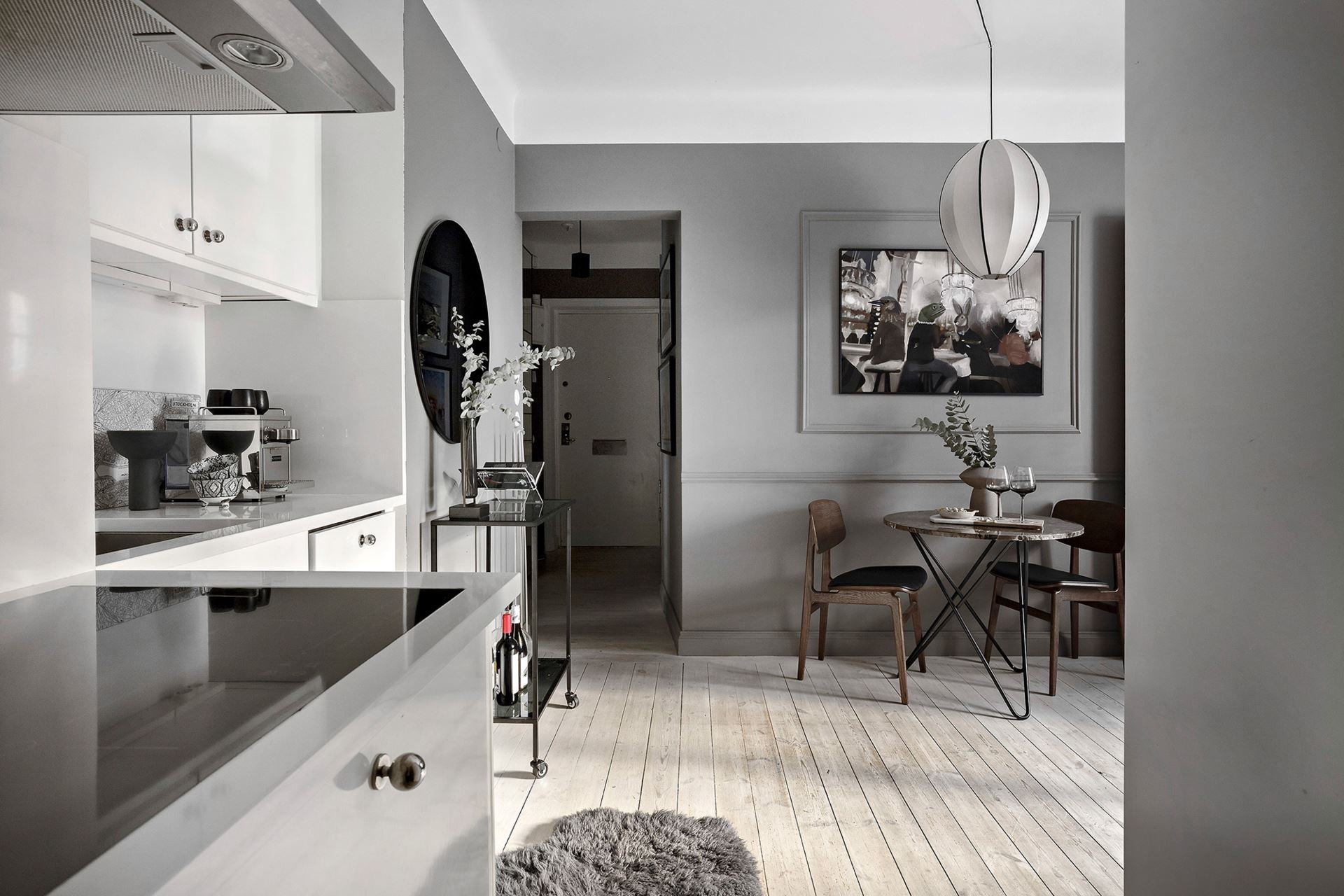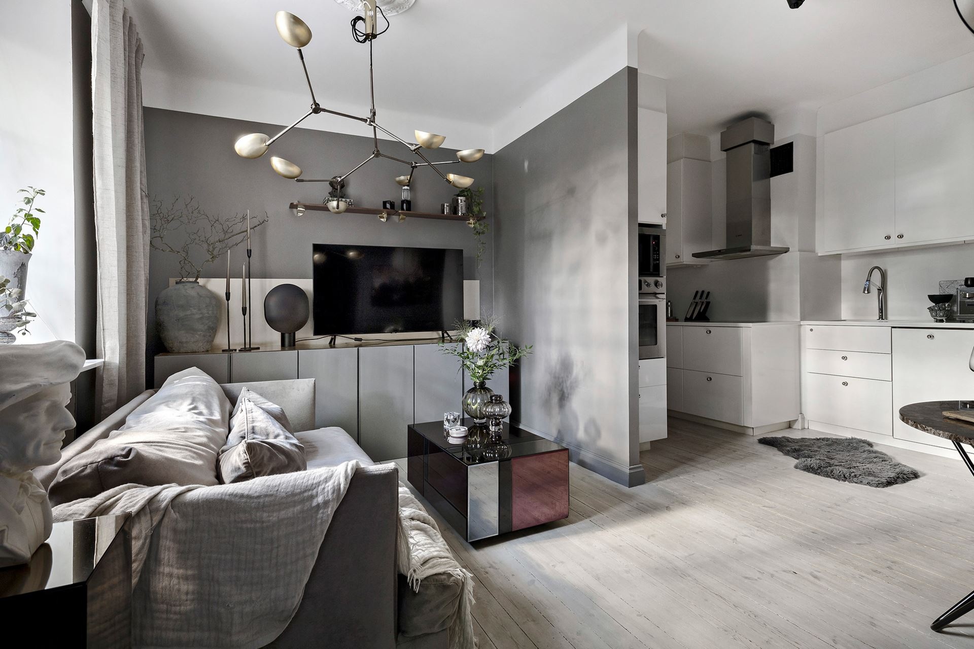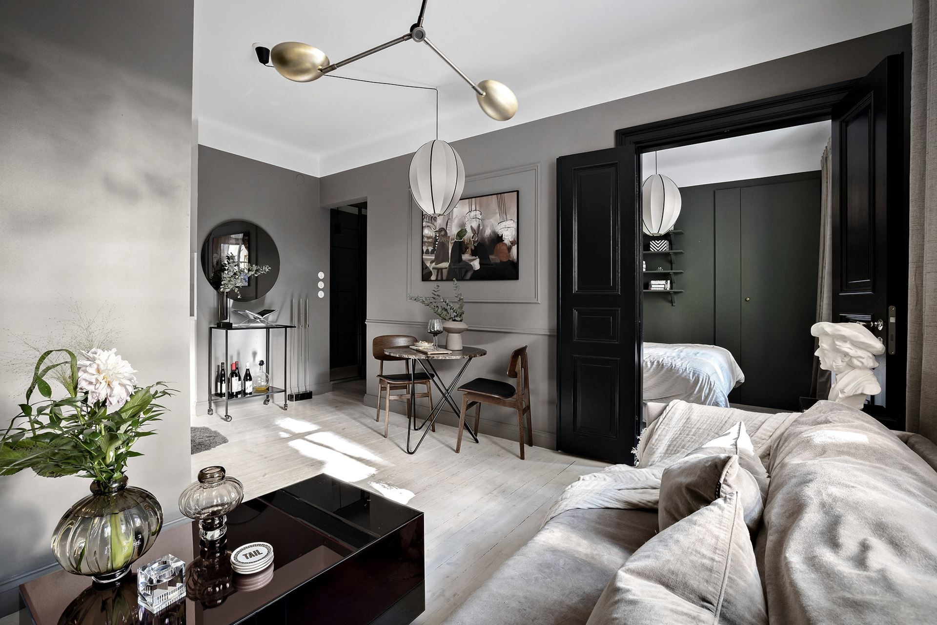 Van valami megkapó a monokróm megjelenésű otthonokban, főleg, ha egy sötétebb tónus vagy szín dominál benne. Ebben a mindössze 38 nm-es lakásban a grafit és a fekete színekre esett a választás, amiket igazán a képek és a választott bútorok keltenek életre, mintha csak Wednesday Addams otthonában járnánk. A világos mennyezet és a padló pont elég fénnyel ellensúlyozza a komorságot, a csillogásról pedig a különböző bútorfelületek gondoskodnak. A tereket jól optimalizáltál, ezek közül is a konyha elhelyezése sikerült igazán ötletesre, ahogyan eltolták egymáshoz képest az elemeket, így nem veszítettek értékes négyzetmétereket.