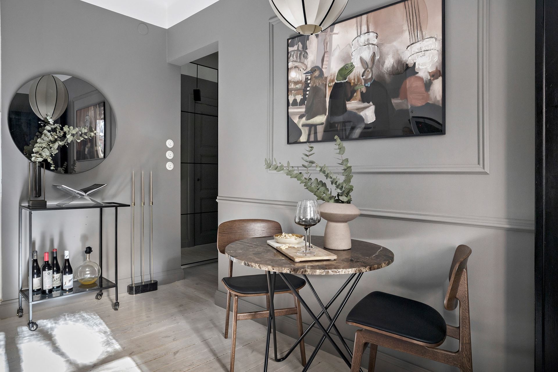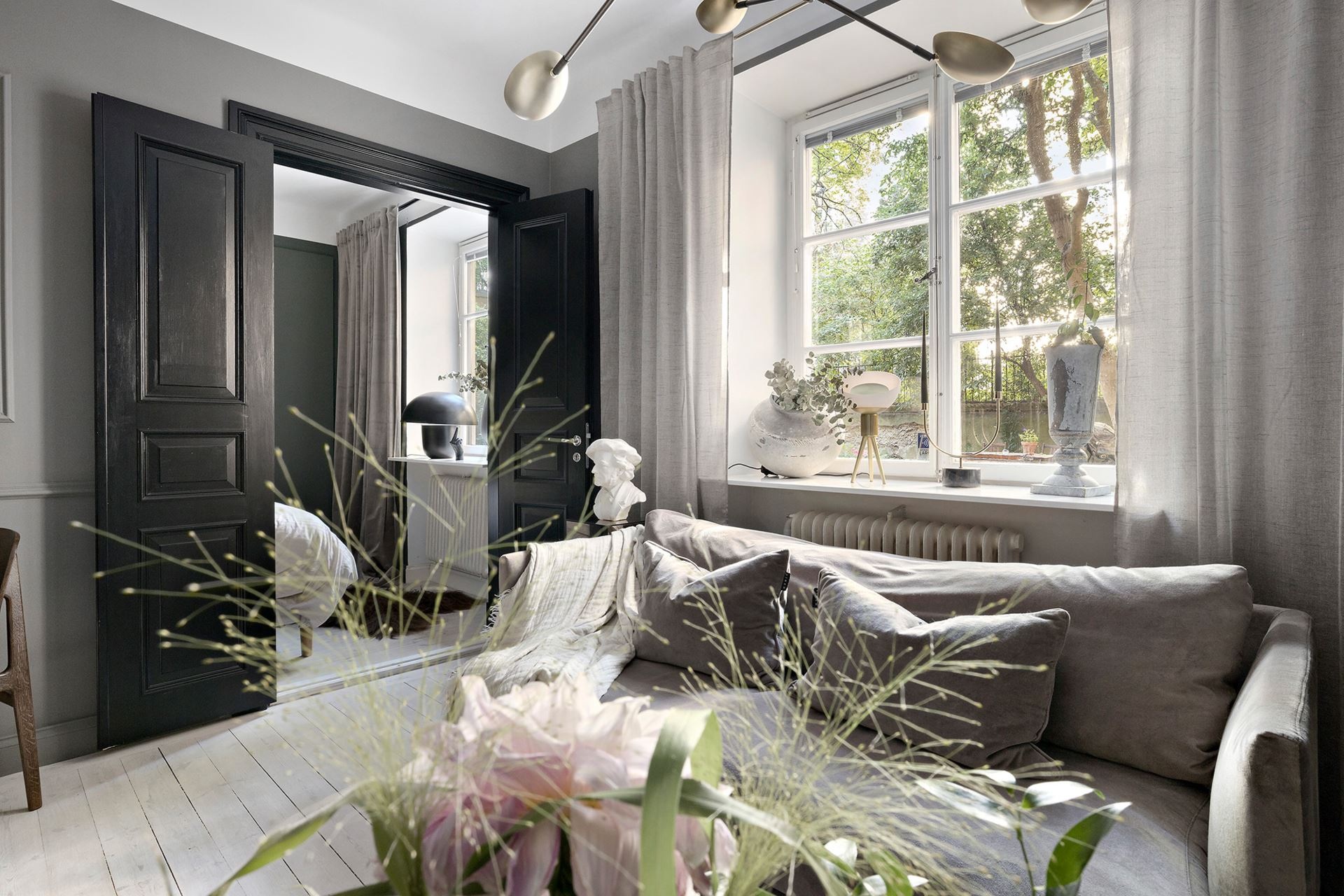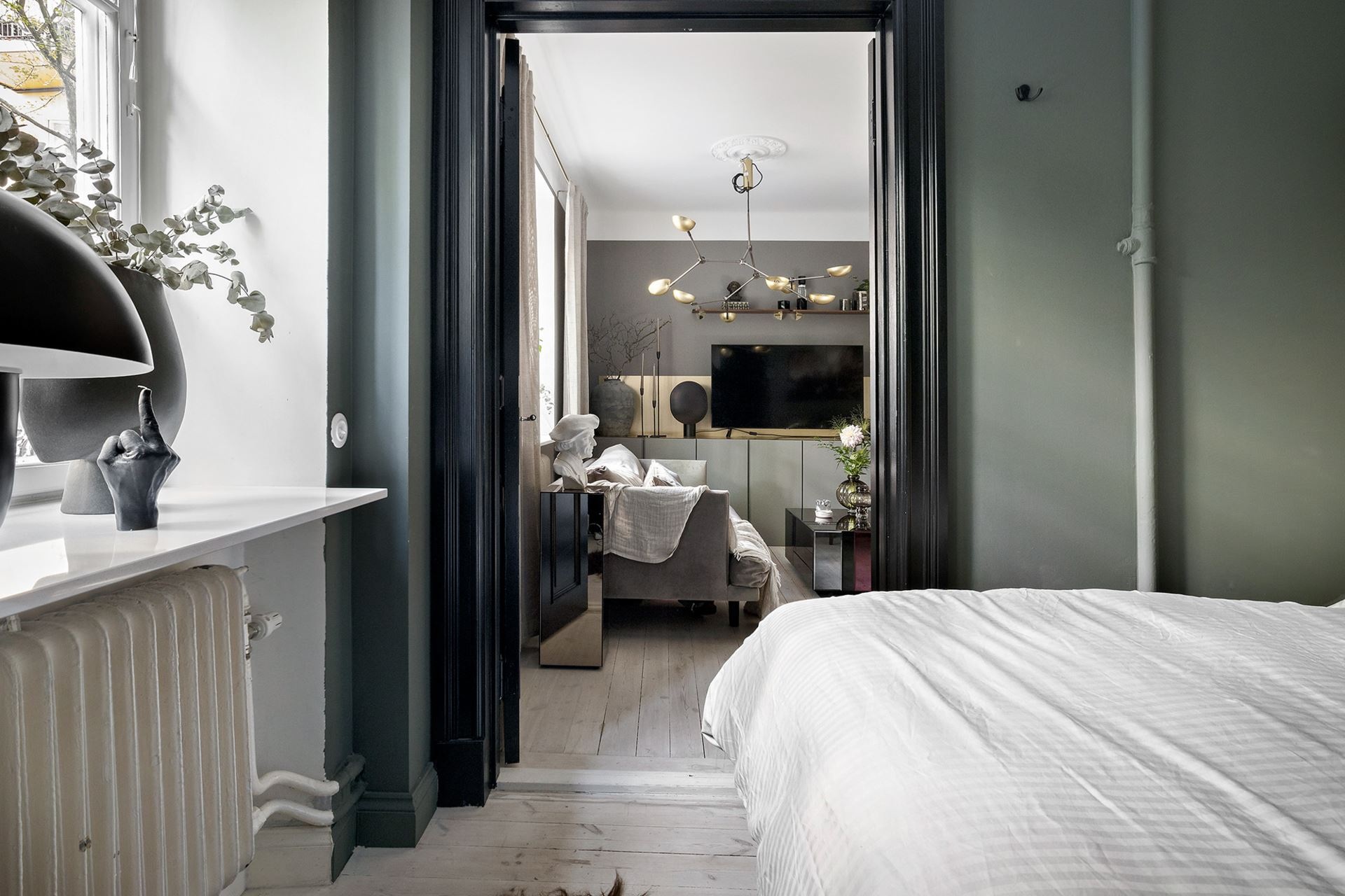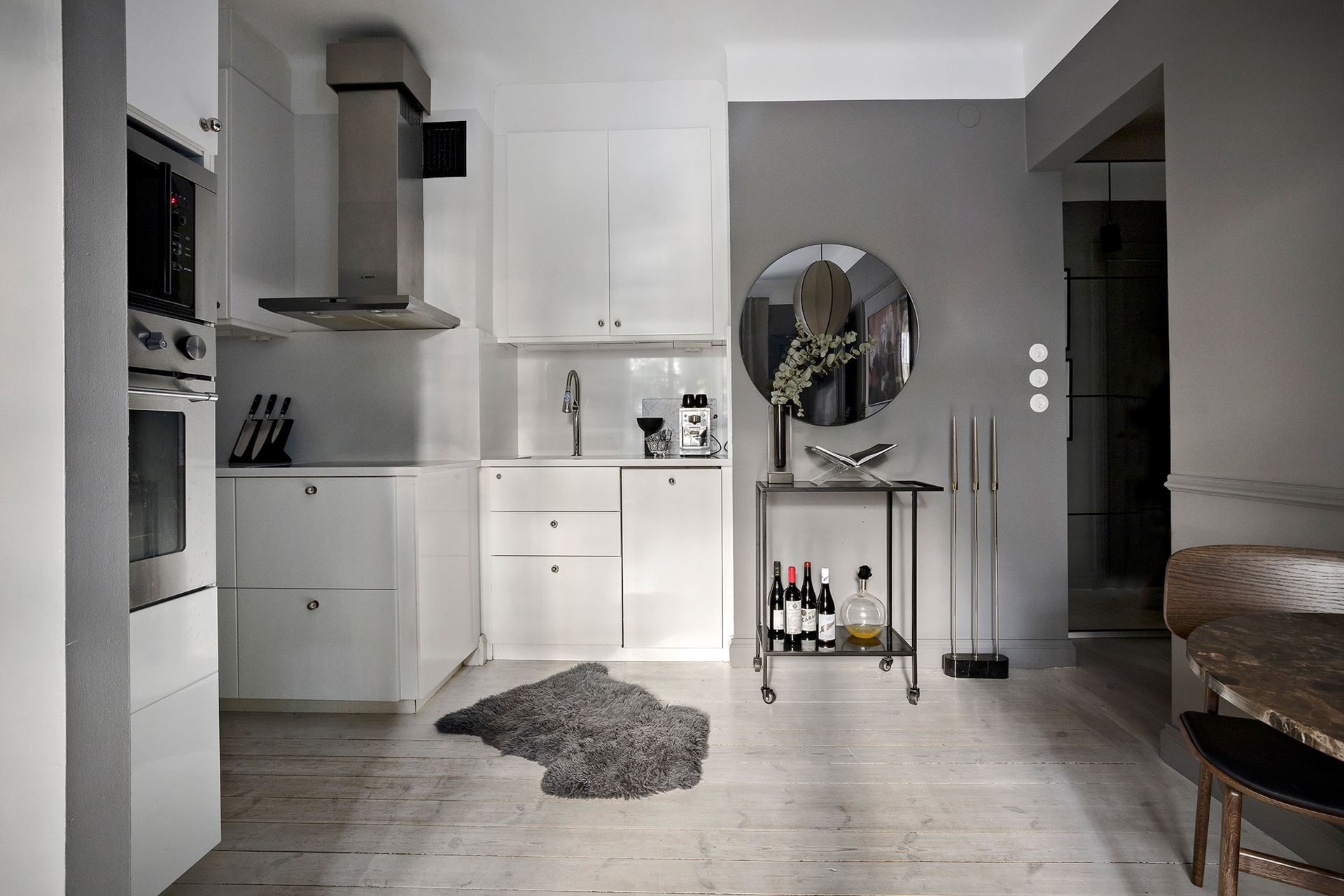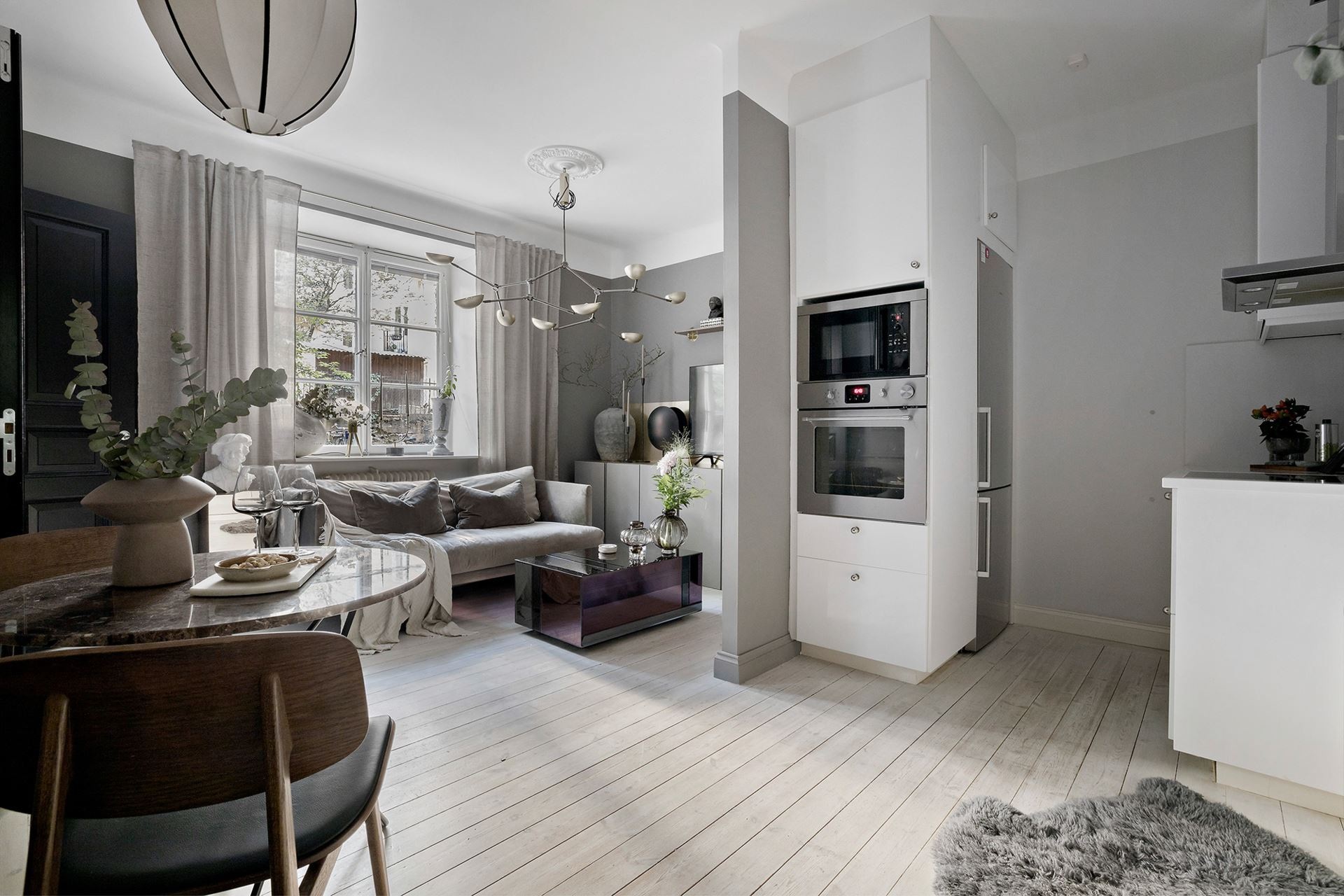 Van valami megkapó a monokróm megjelenésű otthonokban, főleg, ha egy sötétebb tónus vagy szín dominál benne. Ebben a mindössze 38 nm-es lakásban a grafit és a fekete színekre esett a választás, amiket igazán a képek és a választott bútorok keltenek életre, mintha csak Wednesday Addams otthonában járnánk. A világos mennyezet és a padló pont elég fénnyel ellensúlyozza a komorságot, a csillogásról pedig a különböző bútorfelületek gondoskodnak. A tereket jól optimalizáltál, ezek közül is a konyha elhelyezése sikerült igazán ötletesre, ahogyan eltolták egymáshoz képest az elemeket, így nem veszítettek értékes négyzetmétereket.