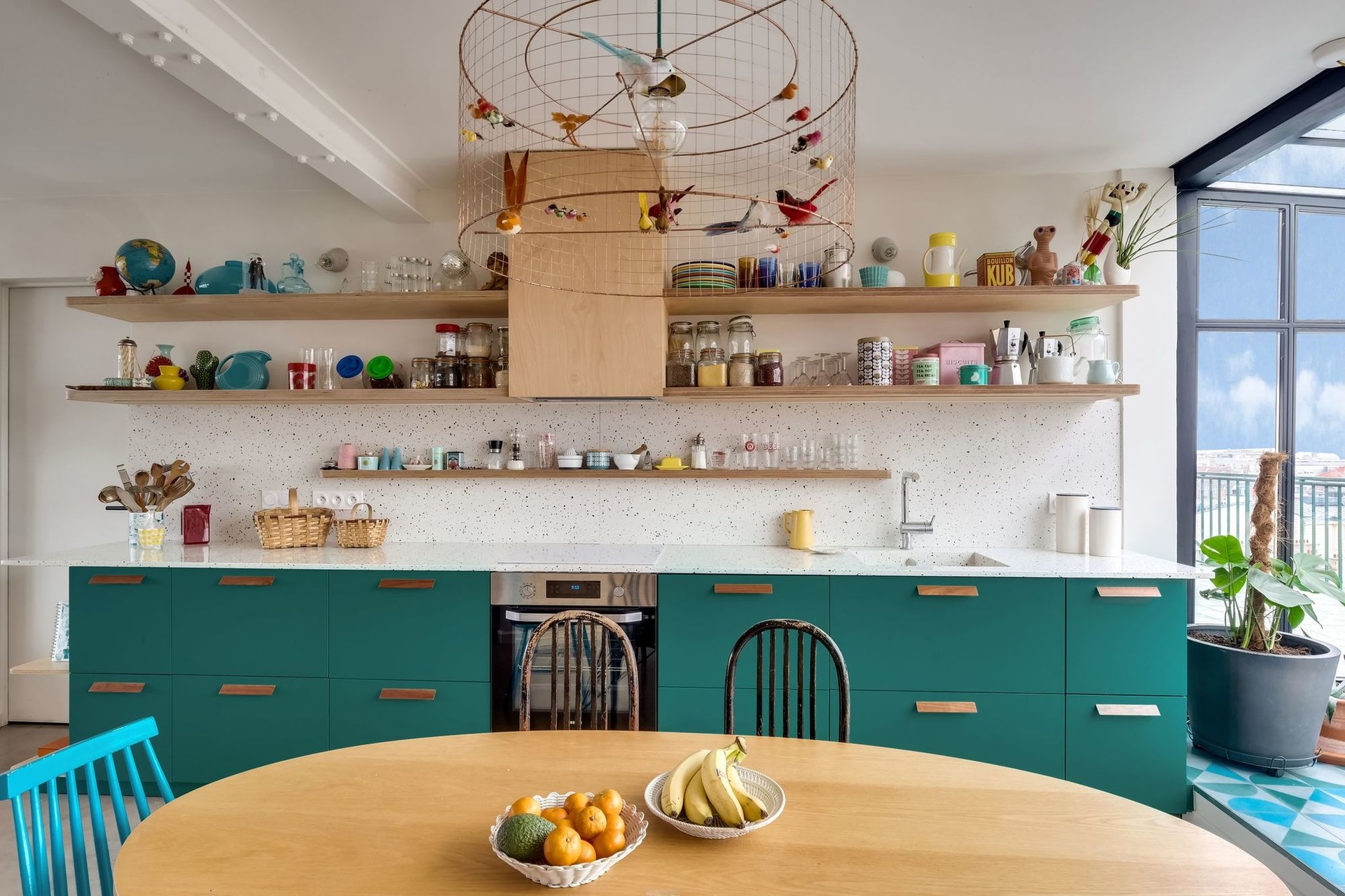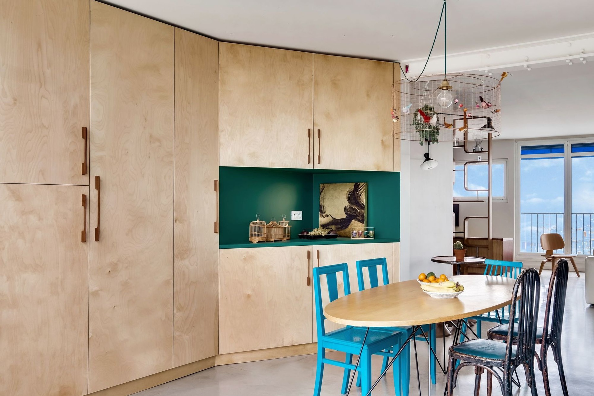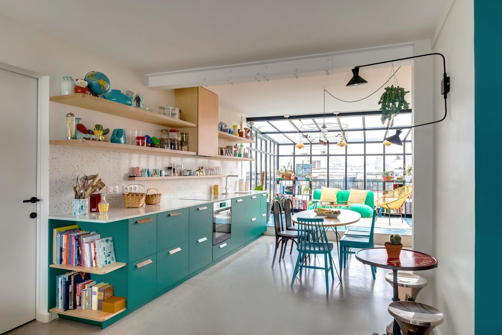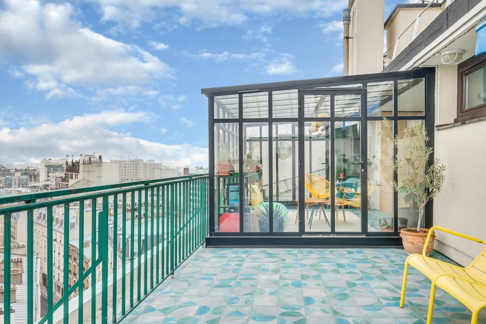 Párizs keleti részén, egy 1970-es évekbeli épület legfelső emeletén egy városra néző terasz található. A nappali terének kibővítéséhez a két tehetséges belsőépítész, Carla Lopez és Margaux Meza a Transition Interior Design cégtől az erkély télikertté való átalakítását javasolta, amely igazán különlegessé tette a szobát. Ezzel a meghosszabbítással 40-ről 52 m²-re nőtt a helyiség, és most fényben fürdik. A gyönyörű színekkel teli kortárs dekoráció hihetetlen jól mutat ebben a lakásban.