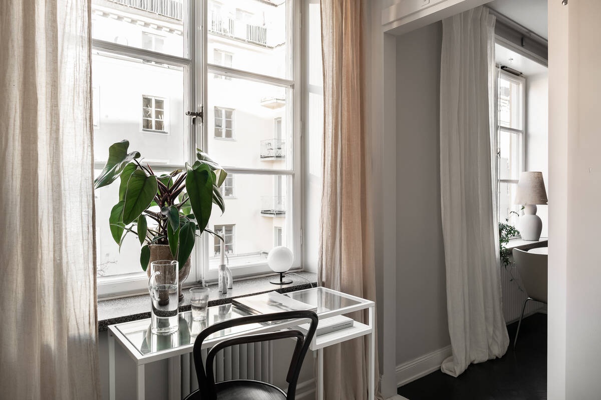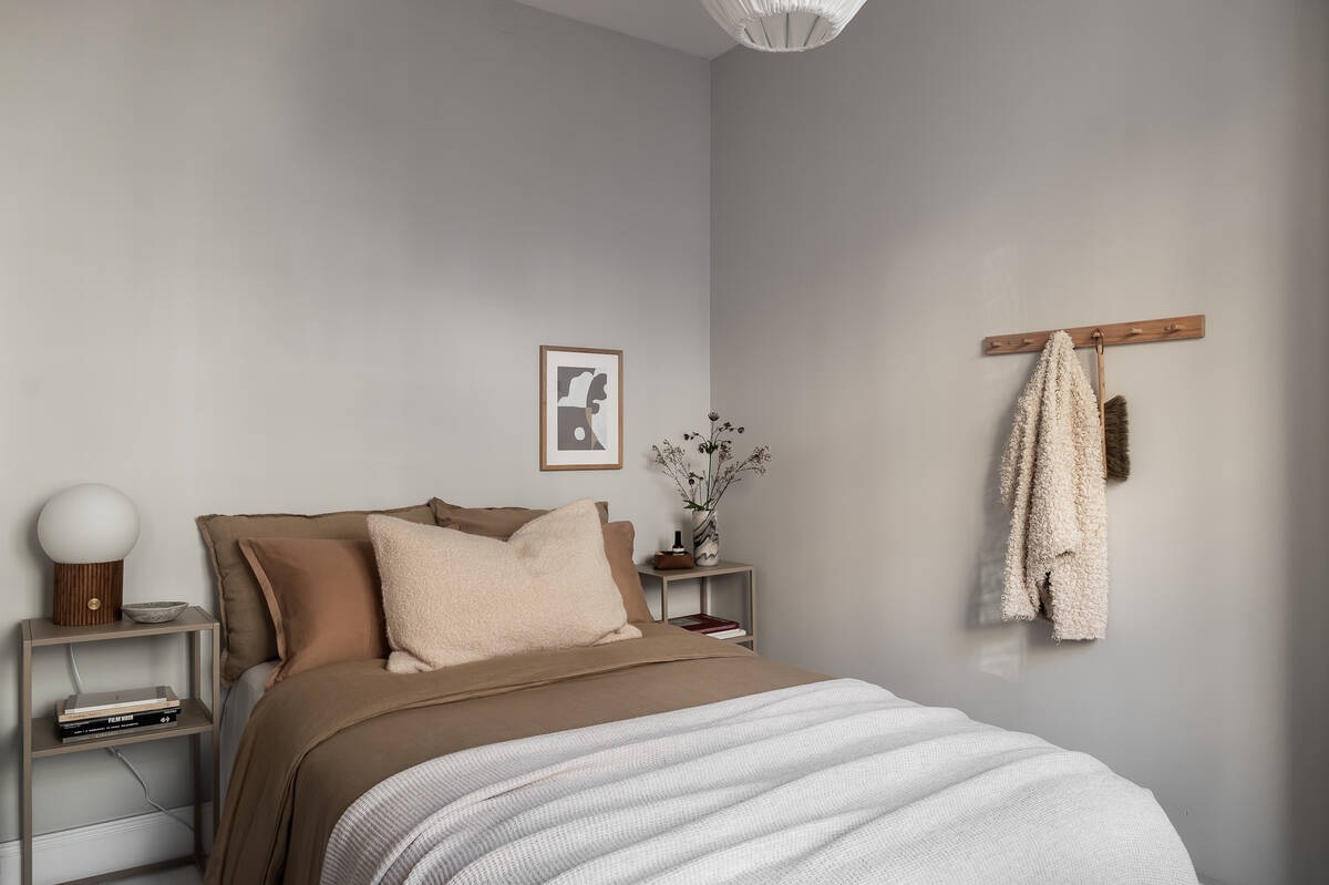 Az itt bemutatott 43 m²-es lakás remek példa arra, hogyan tervezzük meg egy ilyen kis térben a funkciókat. A kulcs az átgondolt térkapcsolatokban rejlik, amit ebben az esetben egy nappaliból leválasztott, nyitott konyhai résszel oldottak meg. A konyha bár kicsi, de a magas fényű bútor rengeteg tárolóhelyet biztosít, ráadásul a minimalista frontok miatt szinte beleolvad a nappali bútorai közé. A konyha párhuzamos elrendezése lehetővé teszi, hogy kevés mozgással főzzünk. A fém rendszerű tolóajtó, a természetes és visszafogott tónusok, a konyhában elhelyezett falilámpák és a feketére festett padló mind olyan részlet, ami egy kis lakásból is kihozza a maximumot.