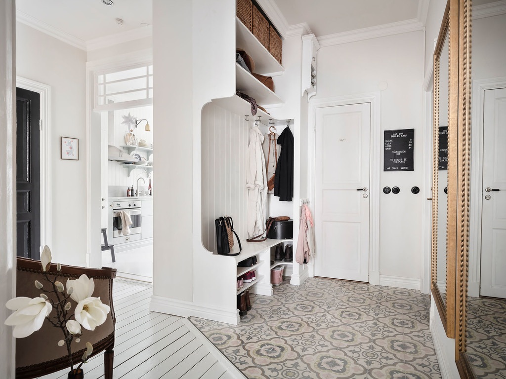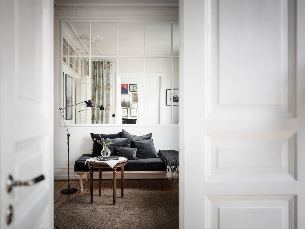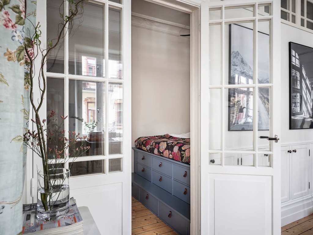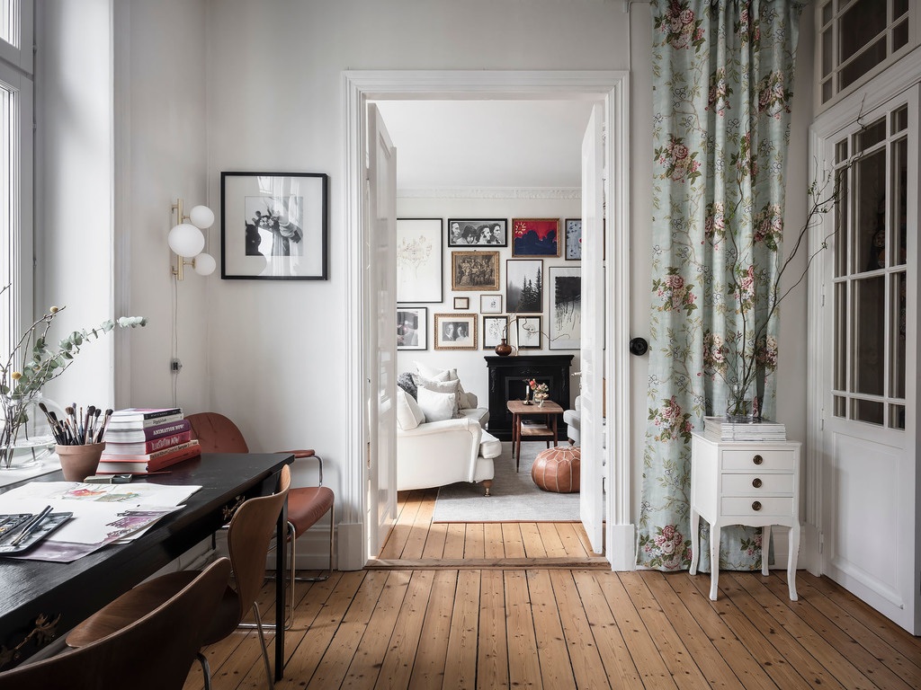 Ez a 1907-ben épült svéd lakás magán hordozza a régi terek utánozhatatlan báját. Nem modern, optimalizált alaprajz várja a látogatót, hanem egy hangulatos, karakteres otthon, ahol minden szobának saját története van. A rusztikus szürke konyha fekete-fehér kockás padlója – gondosan festett parketta – igazi mestermunka. A dolgozószoba egy második nappaliba nyílik, melyet régi üvegfal választ el. A terek egy világos, hosszú folyosóról nyílnak, és megőrizték az eredeti részletek szépségét: stukkókat, rozettákat, régi kandallót és parkettát. A berendezés a kortárs, vintage és vidéki hangulat kiegyensúlyozott keveréke, amely elegáns, mégis otthonos.
