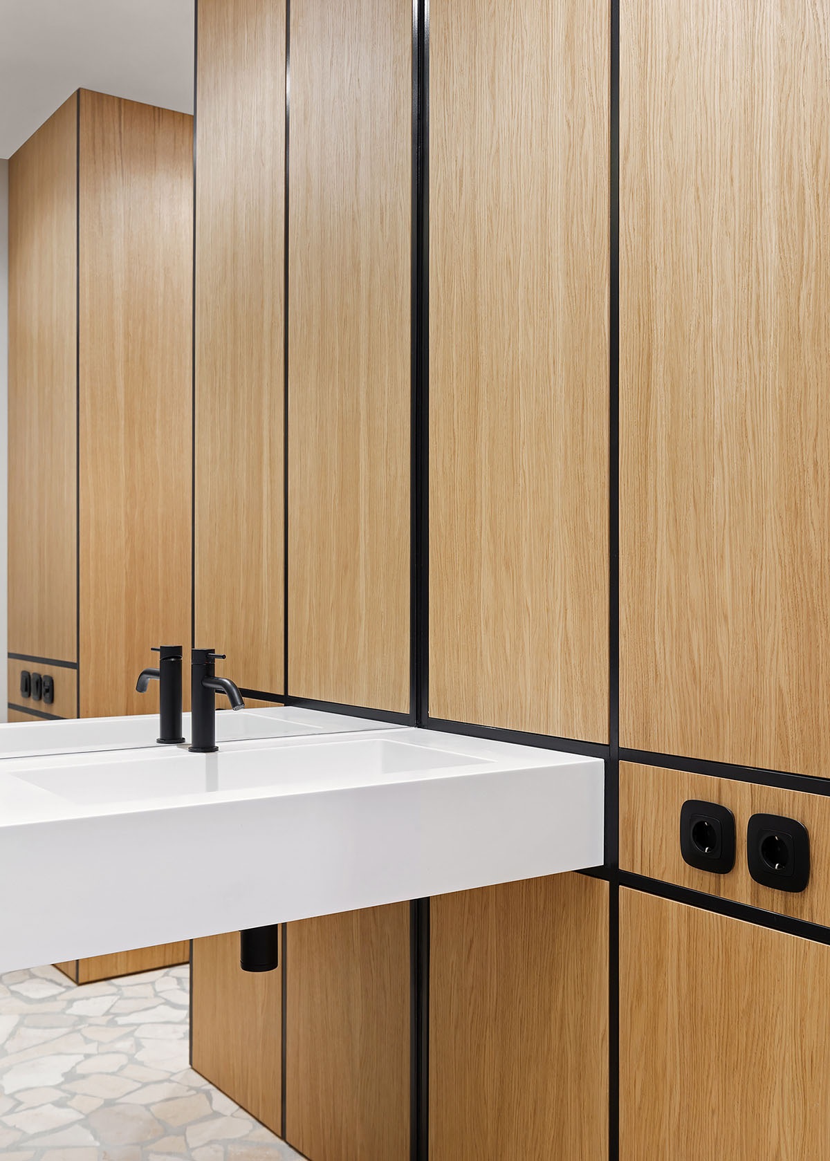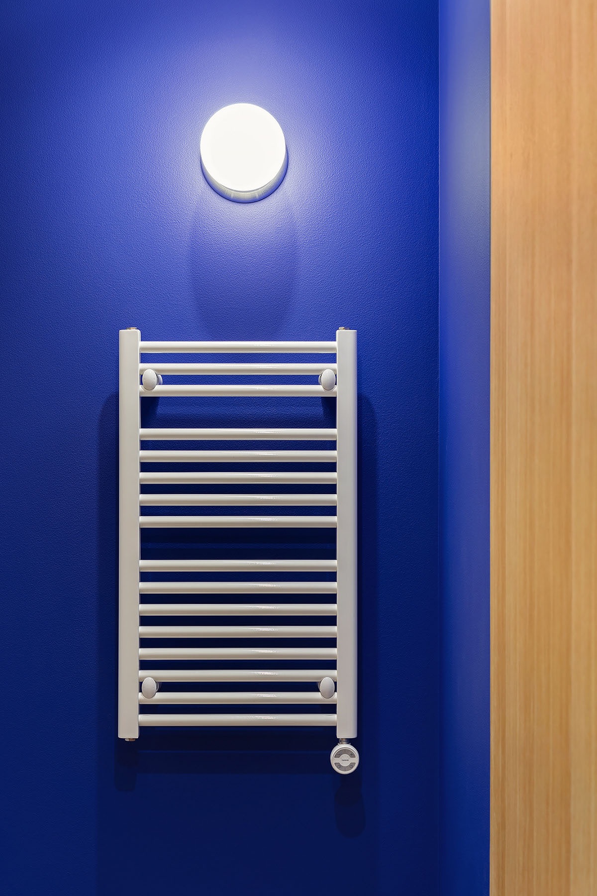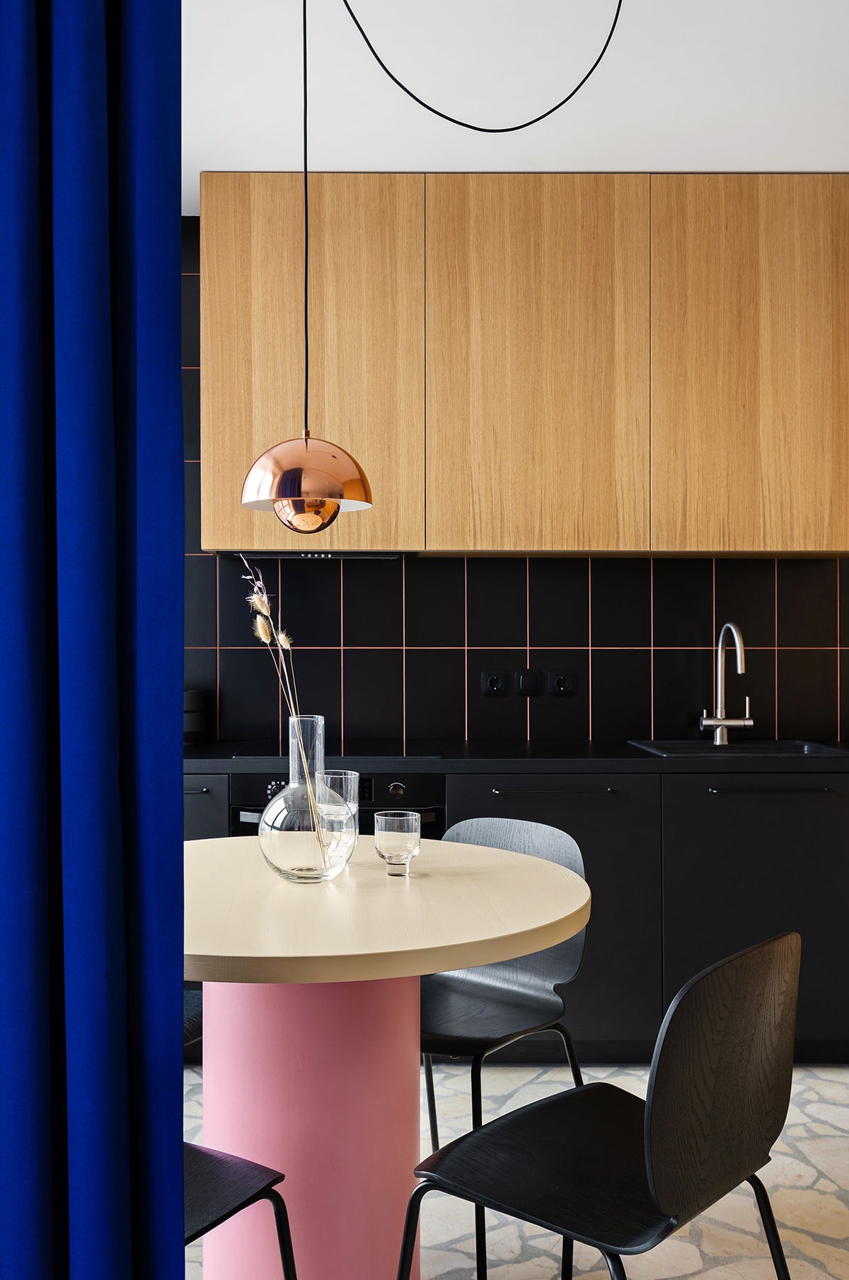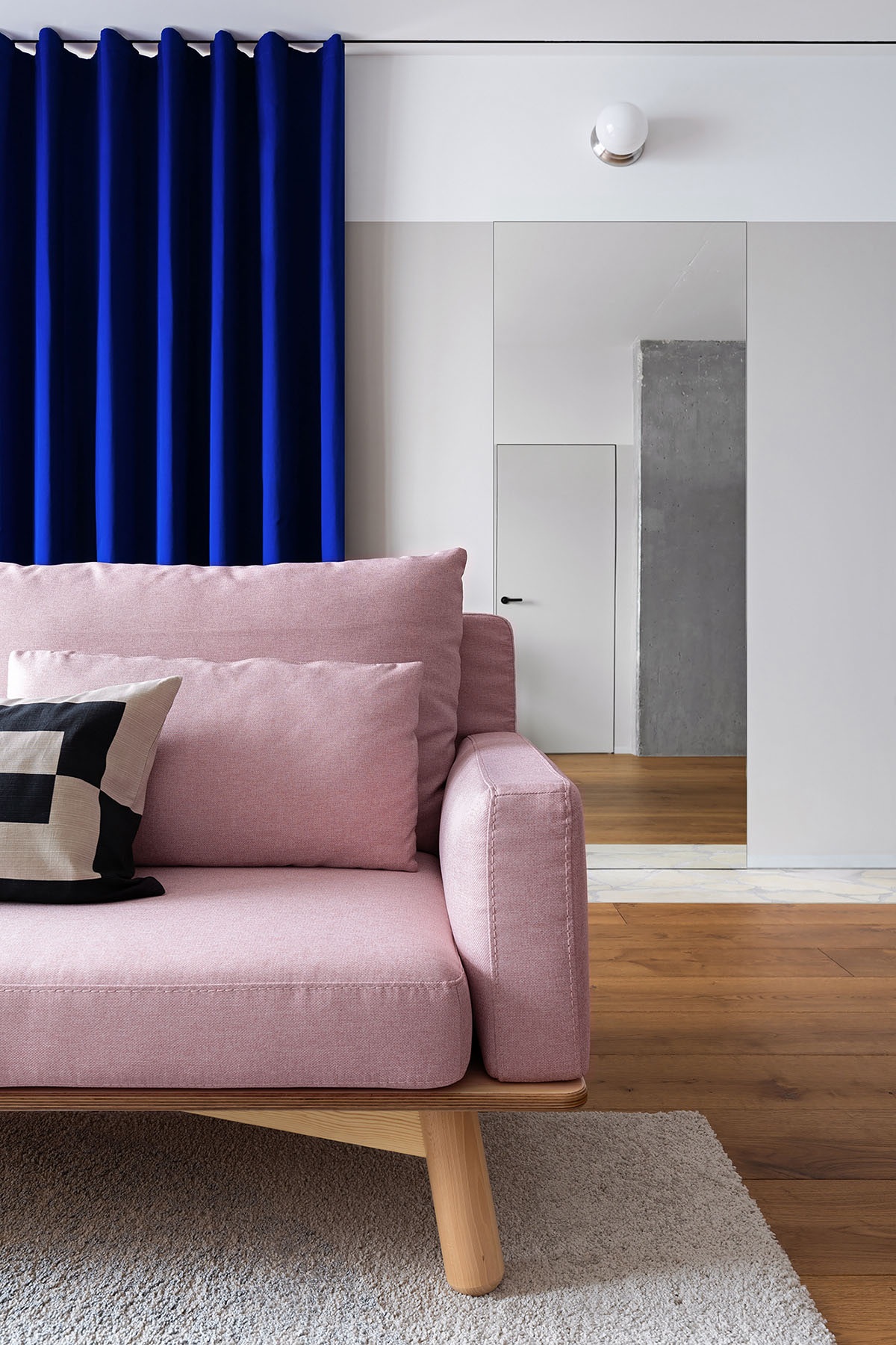 Akár egy mértani pontossággal kimért térbeli alakzat, olyan összhatást kelt az alábbi lakás. Az egyenes vonalak és az éles szögek dinamikusan és játékosan osztják fel a tereket a fekete, a fehér, a púderrózsaszín és a merész királykék felhasználásával. Az optikai játékra még inkább ráerősítenek a lakás különböző tereiben felbukkanó tükrös elemek. A falba süllyesztett ajtók és szekrények körvonalaival nagyon érdekes hatást kelt a királykék színű térelválasztó függöny, ami több helyen is felbukkan ugyanebben a funkcióban, például elválasztja a nappalit a konyhától.