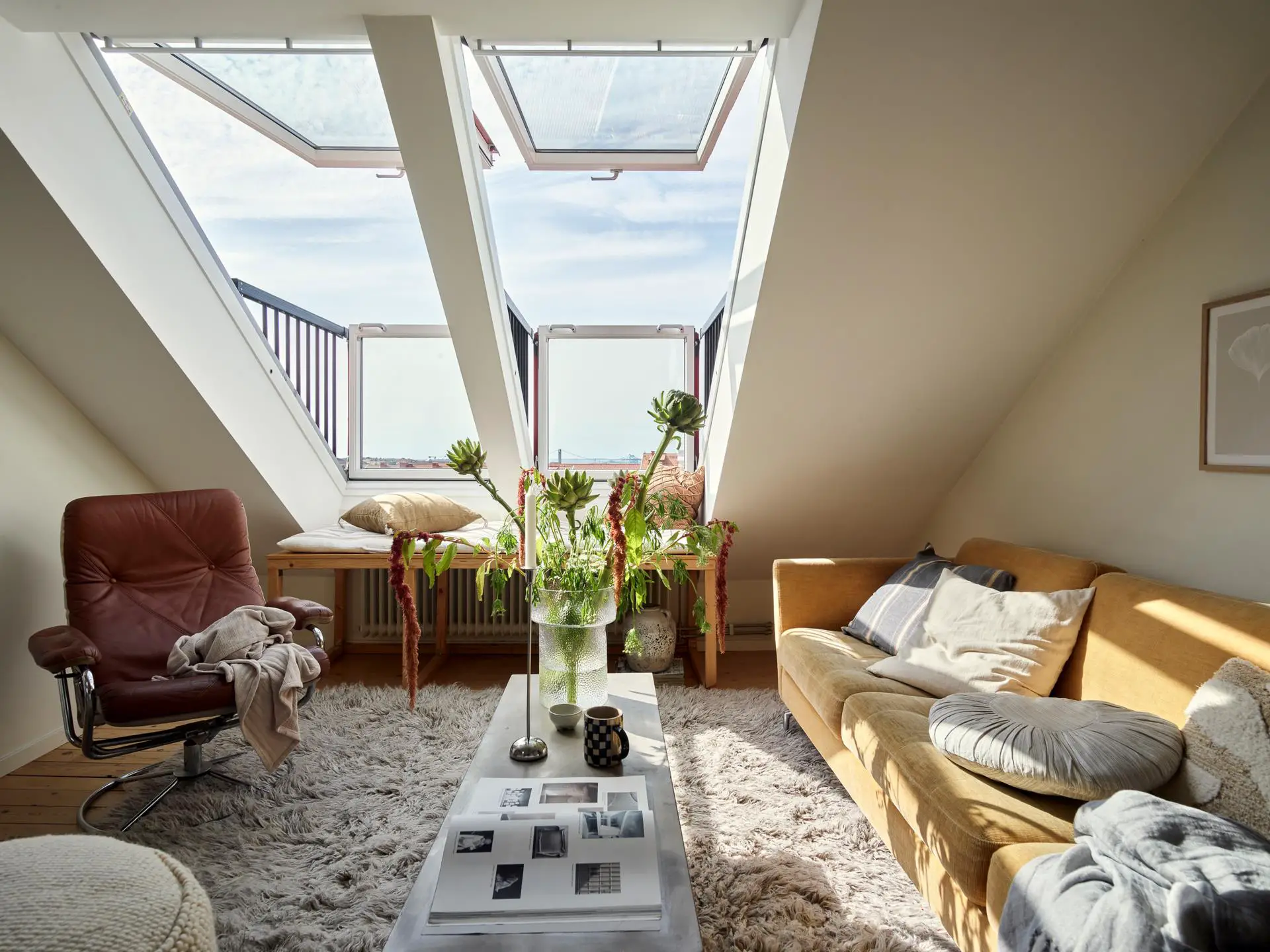 A tetőtéri ablakainak köszönhetően benapozott, nagyon világos, 74 négyzetméteres, belső kétszintes tetőtéri lakás a tetőtér felújítása után kapta meg végleges formáját. Lakói vidám színekkel és skandináv szellemben rendezték be, különös gondot fordítva a dekorációs elemekre.