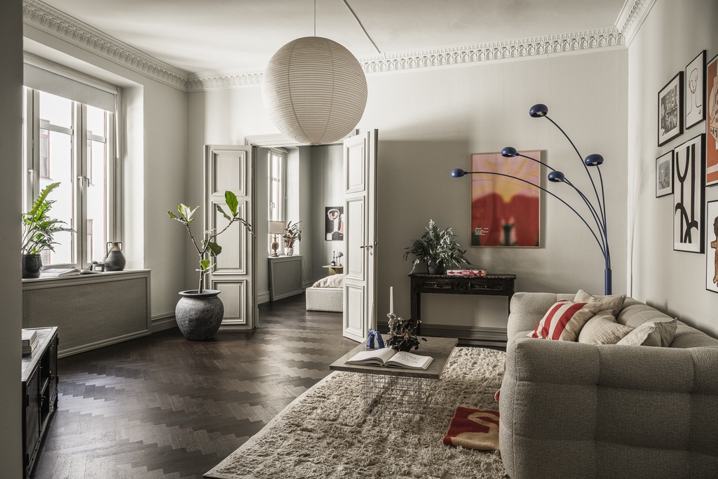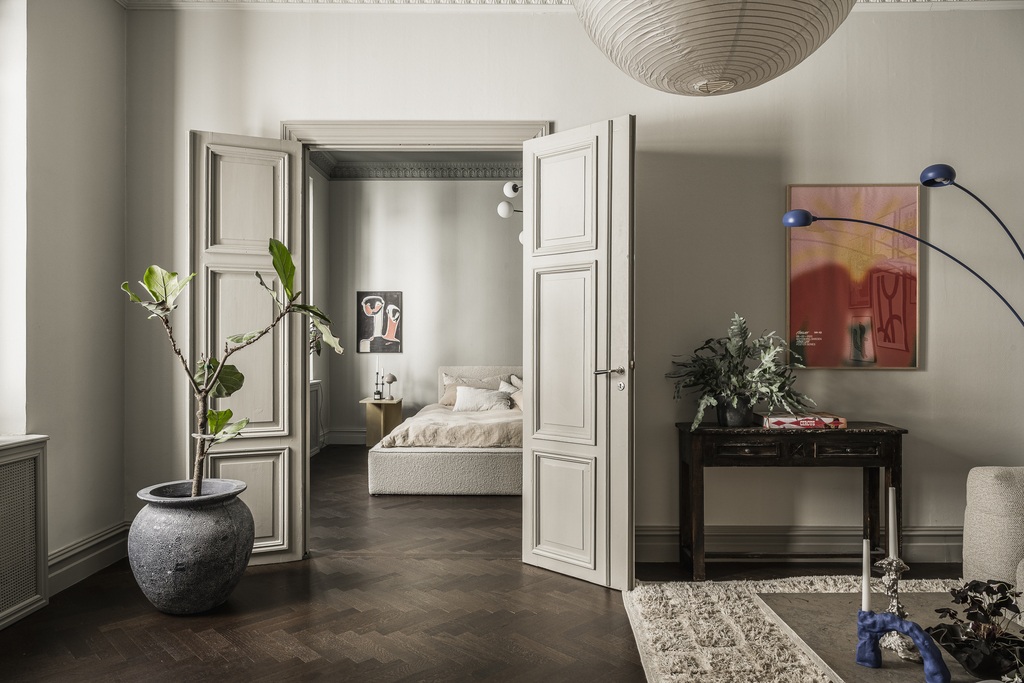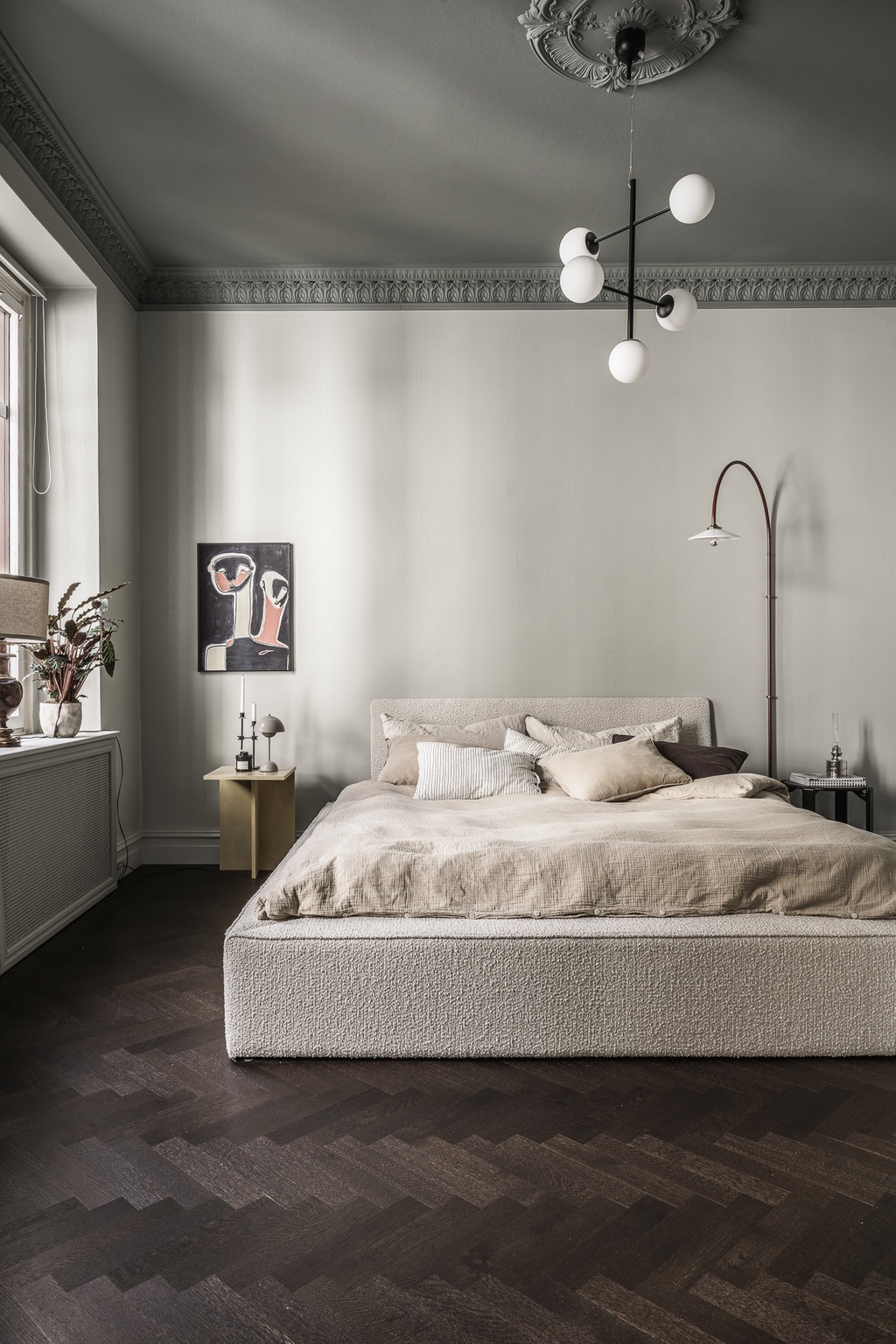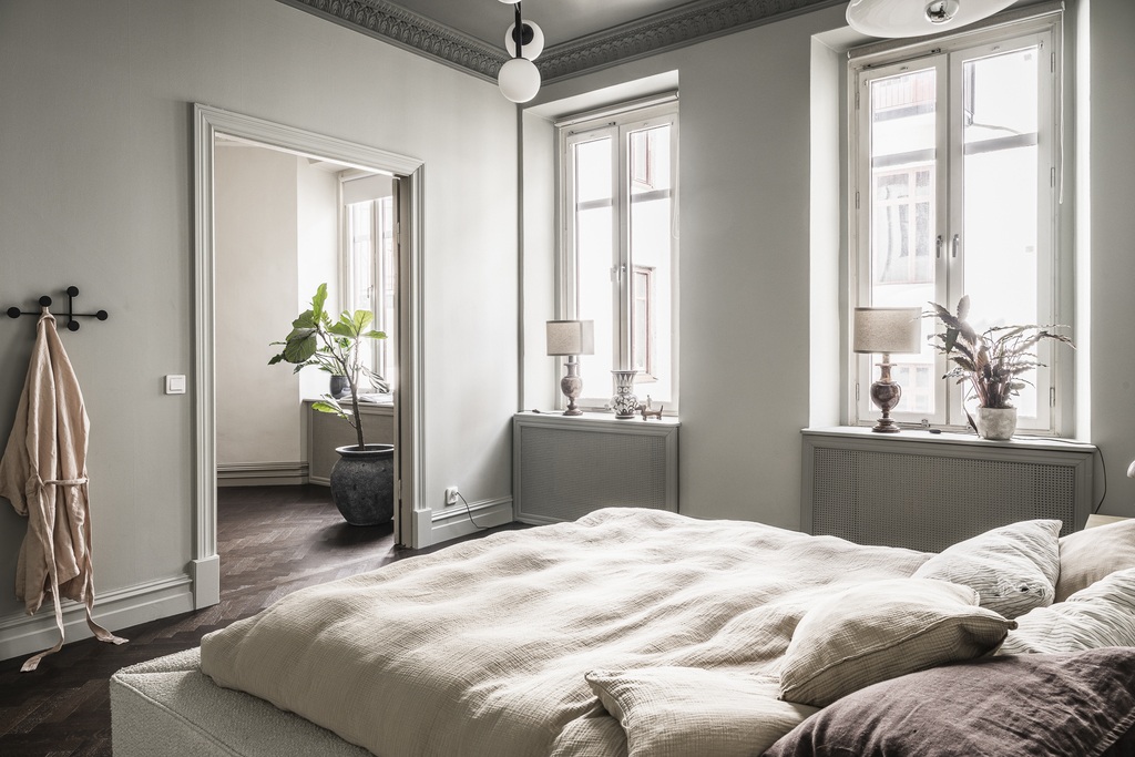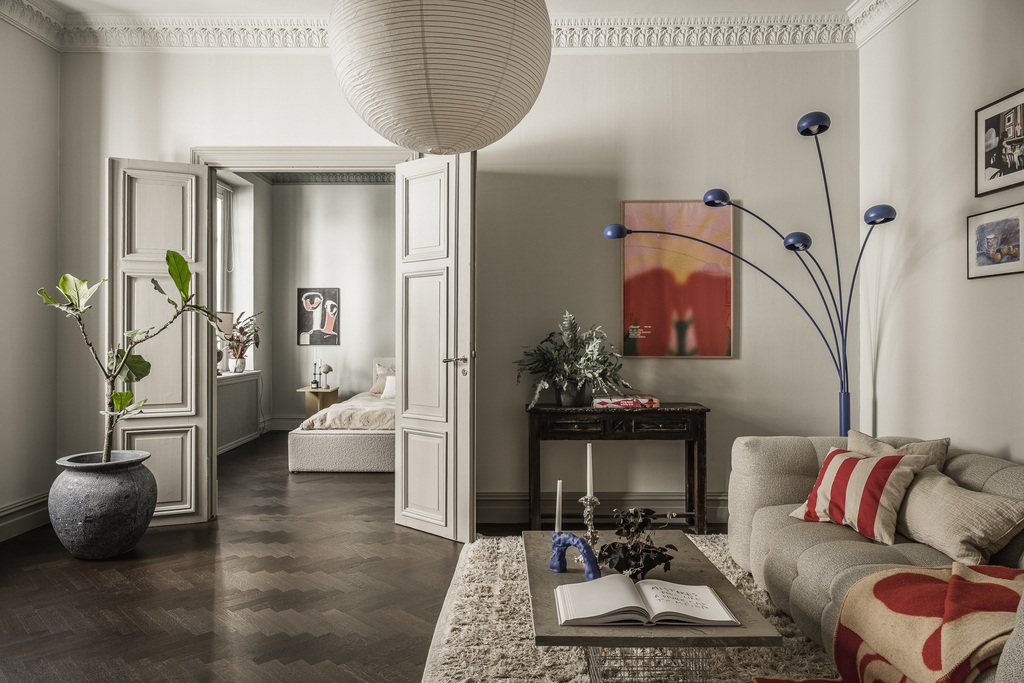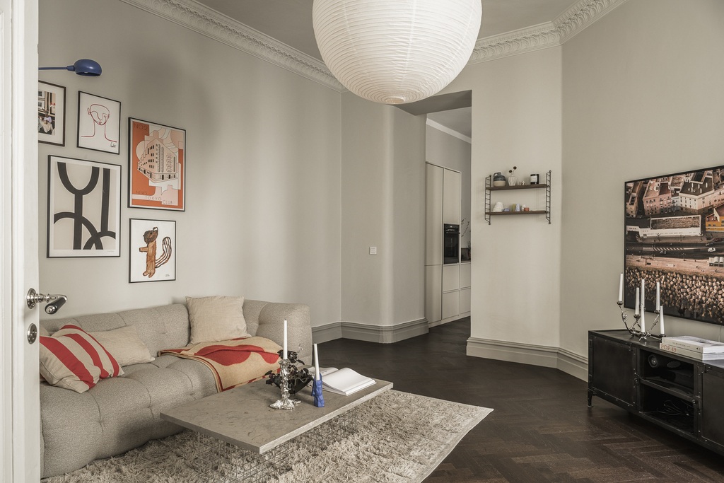 Ez a lakás kiváló példája annak, amit az angolok „A Váratlan Piros Elmélete” (The Unexpected Red Theory) néven emlegetnek. Az elmélet arról szól, hogy hogyan befolyásolhatja egy piros tárgy az uralkodó berendezés hangulatát. Vegyük ezt a klasszikus stlílusú lakást, ahol a díszlécek, magas mennyezet, régi parketta és a semleges tónusok teljesen új értelmet nyernek az itt-ott megjelenő piros kiegészítőkkel, dekorációkkal. Ugyannakor ez az otthon annyira gyönyörű, hogy a piros szín nélkül is ugyanolyan csodálatos lenne. A konyha és a fürdőszoba álomszép, de a hálószoba is elképesztően elegáns és kifinomult a festett mennyezettel.