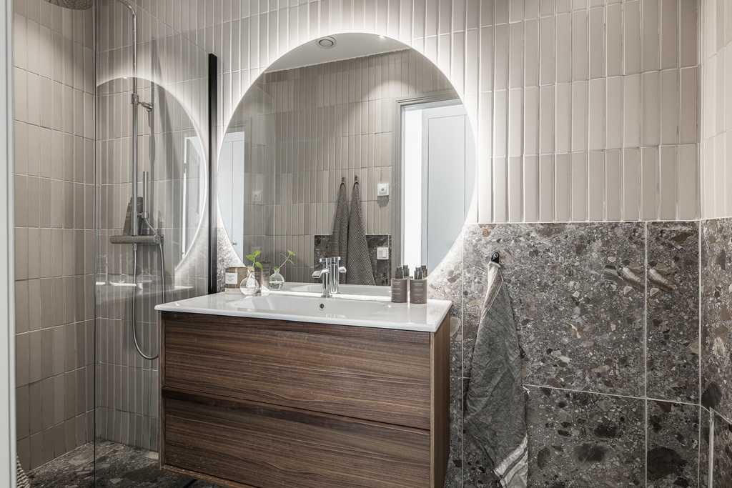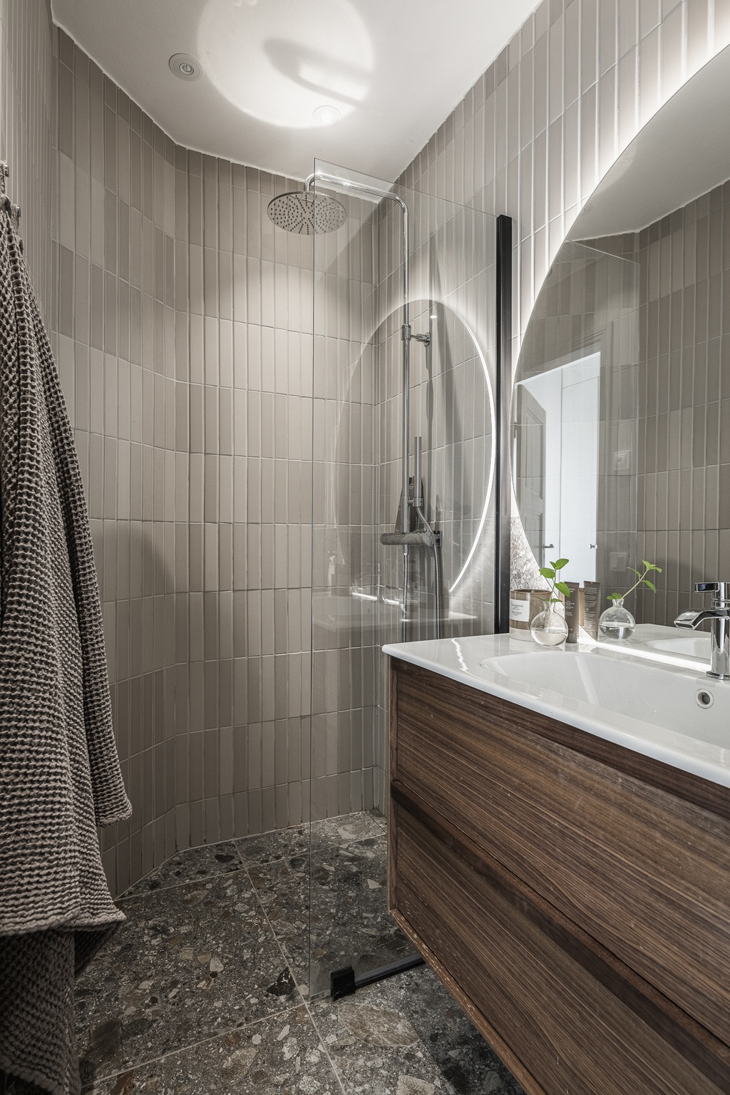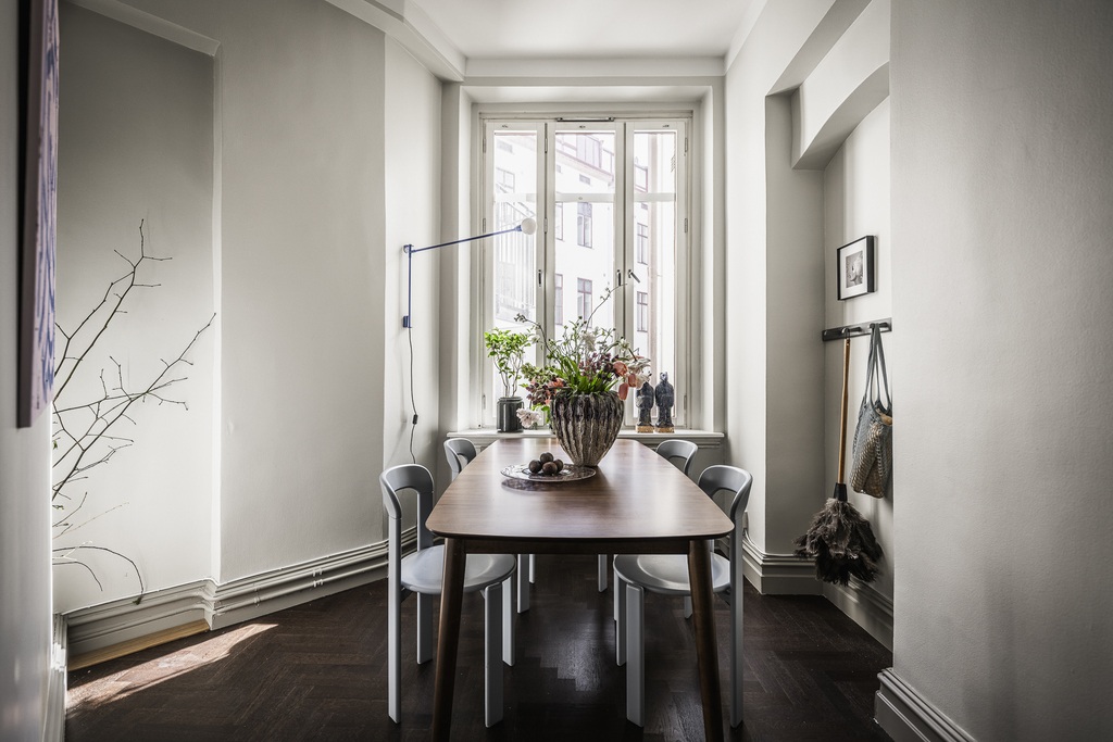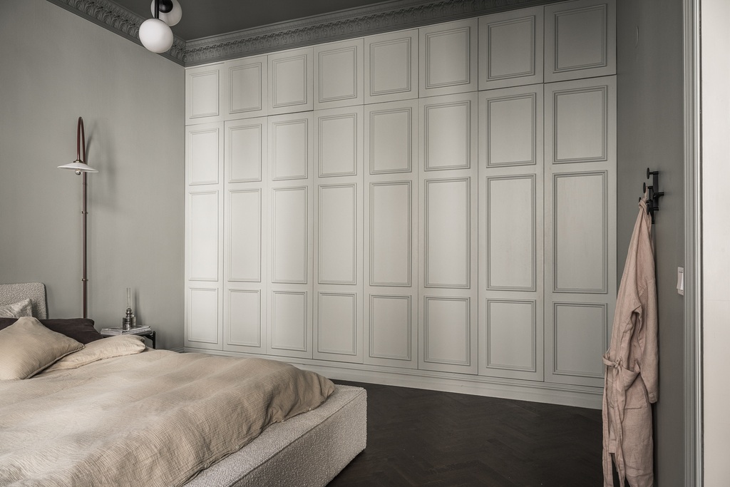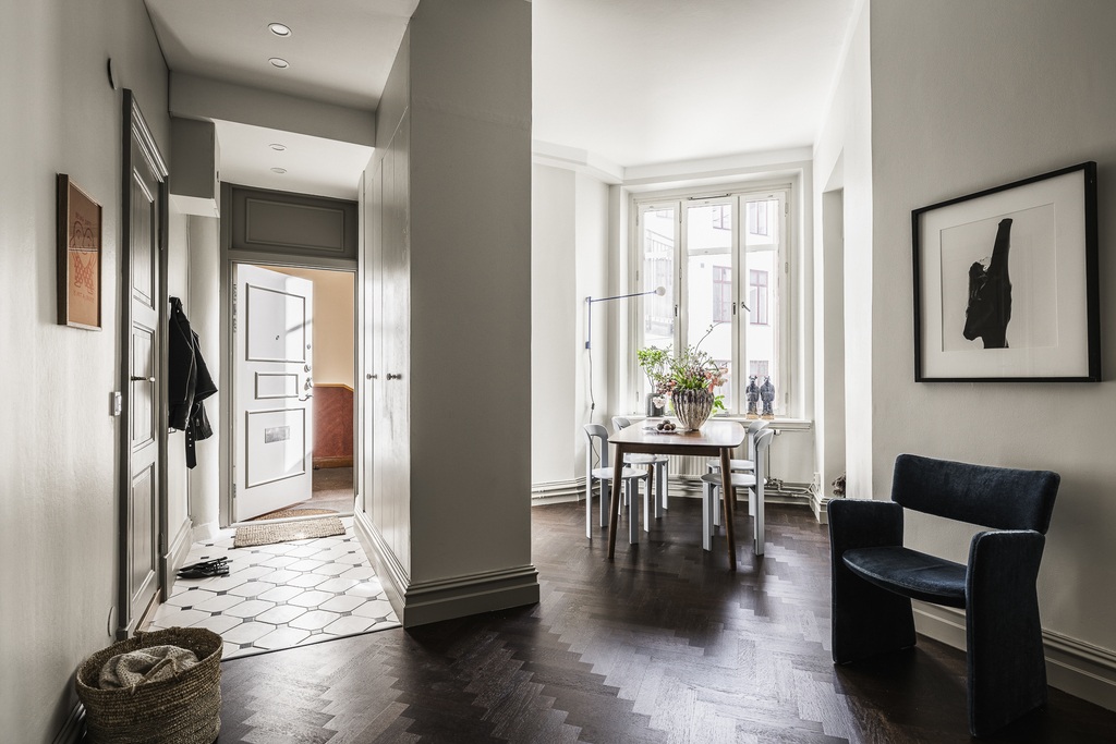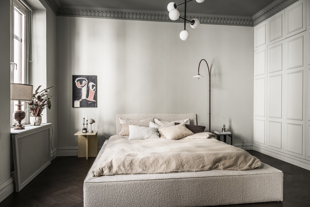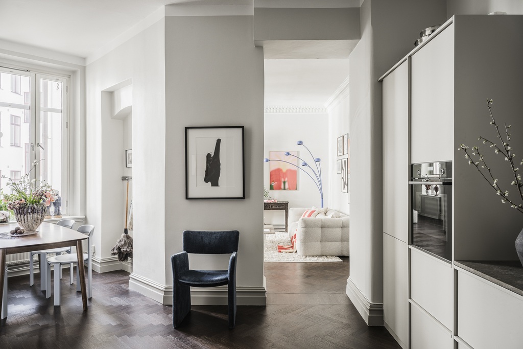 Ez a lakás kiváló példája annak, amit az angolok „A Váratlan Piros Elmélete” (The Unexpected Red Theory) néven emlegetnek. Az elmélet arról szól, hogy hogyan befolyásolhatja egy piros tárgy az uralkodó berendezés hangulatát. Vegyük ezt a klasszikus stlílusú lakást, ahol a díszlécek, magas mennyezet, régi parketta és a semleges tónusok teljesen új értelmet nyernek az itt-ott megjelenő piros kiegészítőkkel, dekorációkkal. Ugyannakor ez az otthon annyira gyönyörű, hogy a piros szín nélkül is ugyanolyan csodálatos lenne. A konyha és a fürdőszoba álomszép, de a hálószoba is elképesztően elegáns és kifinomult a festett mennyezettel.