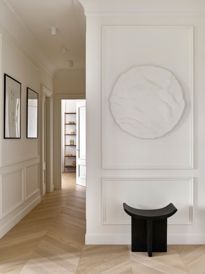 A francia stílust a tervezők és belsőépítészek egyéni módon értelmezik világszerte. Íme egy újabb példa erre: egy elegáns lakás, amelyet Maria Ushakova, az Ushakova Design belsőépítésze tervezett. A lakás tulajdonosa egy filmes és televíziós szakember, aki a lakása felújítását a tervezőre bízta, azzal a kéréssel, hogy olyan dekorációt hozzon létre, amely a párizsi lakásokra emlékeztet. A 120 m²-es ingatlan egy nappaliból, egy konyha-étkezőből, egy fő hálószobából és egy dolgozószobából áll, amely szükség esetén vendégszobaként is használható. A belsőépítész úgy döntött, hogy alapvetően a fekete-fehér kontrasztját használja a berendezéshez, halszálkás parkettát fektet a padlóra és díszléceket tesz a falakra. A nagy ablakok rengeteg fényt engednek be a szobákba, amelyek harmonikusan ötvözik a francia stílust a modern elemekkel.