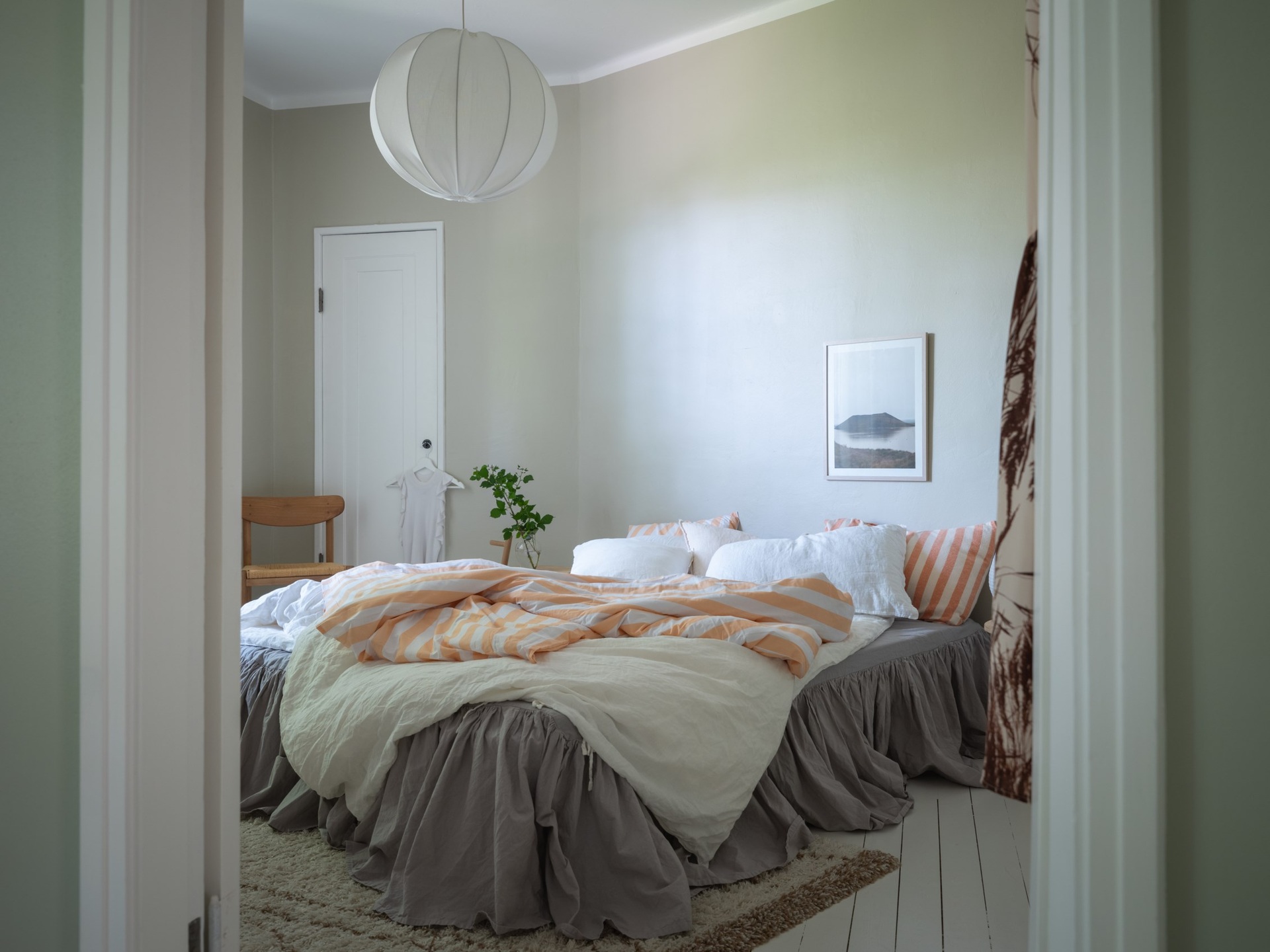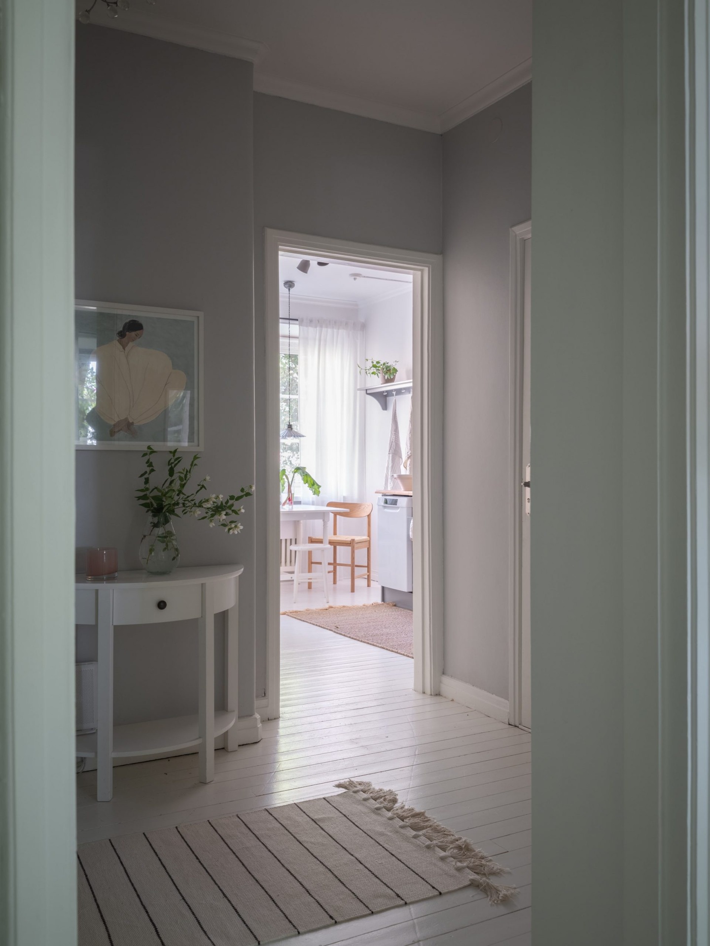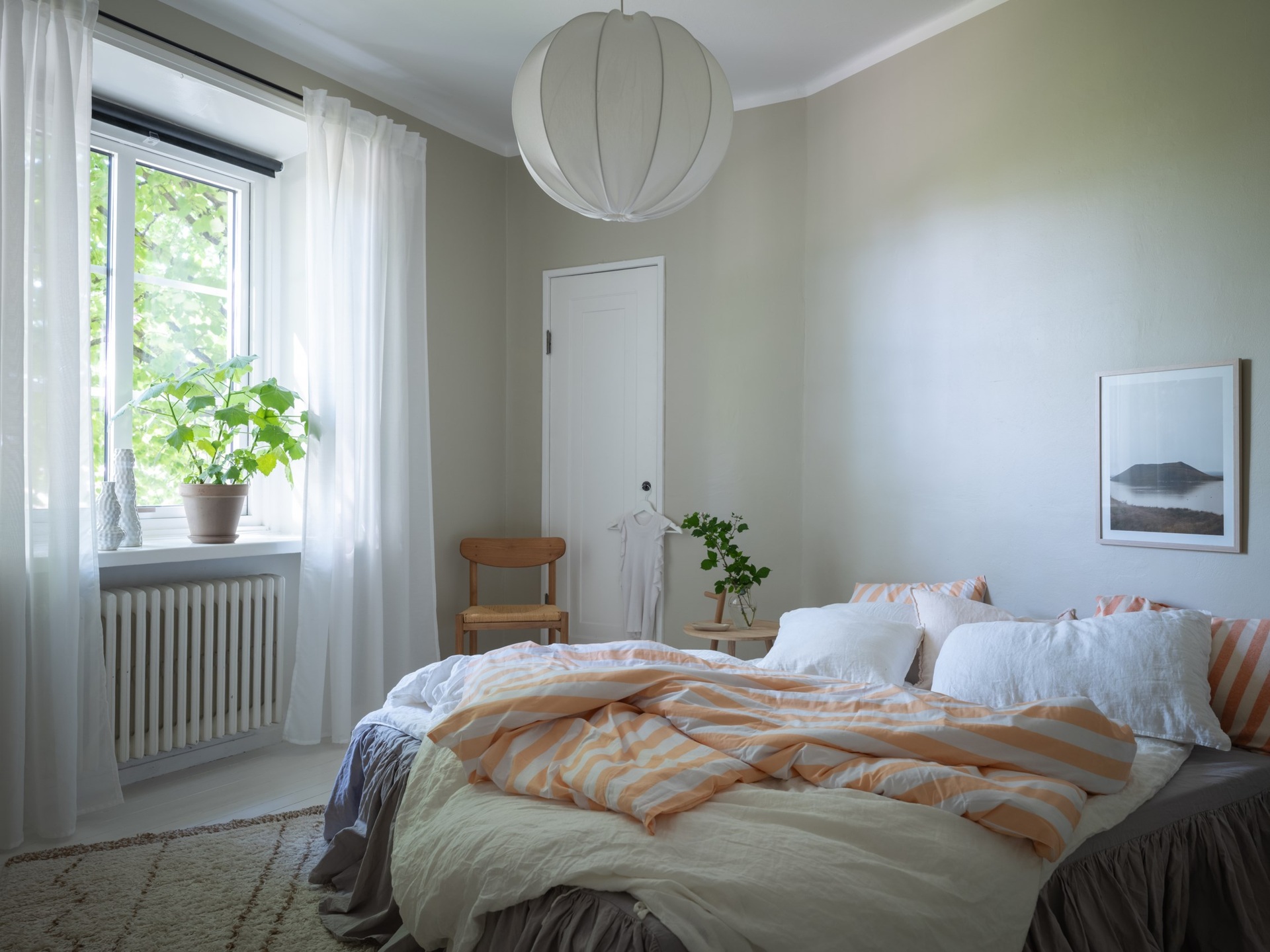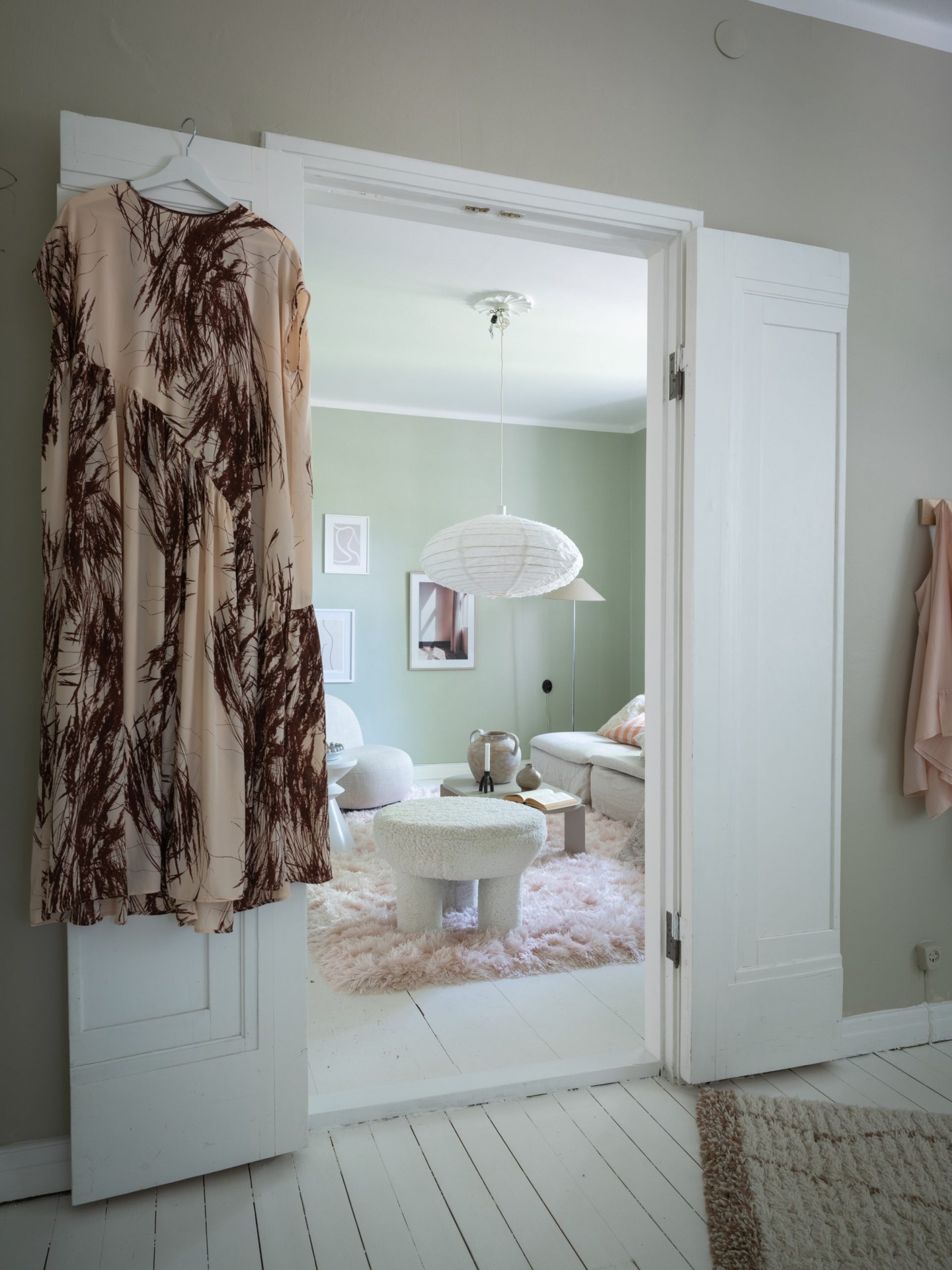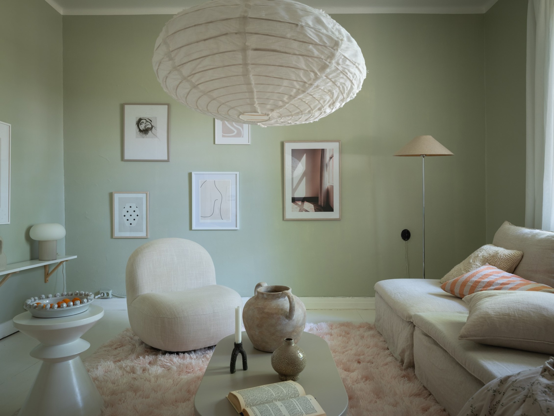 A zöld színre festett fal az egyik népszerű módja annak, hogy a természetet behozzuk egy városi lakásba. Azonban óvatosnak kell lenni a zöld színnel is, ugyanis nyomasztóan hathat, ha minden falfelületen megjelenik. Az itt megjelenő árnyalat puha és ragyogó, ezért hogy a falszín megőrizze finom, nyugtató tulajdonságait a lakás bútorainak és berendezési tárgyainak visszafogottabbnak kellett lenniük. A nappaliban használt friss zöld szín mellé fehéret és némi korallos rózsaszínt választottak kiegészítésnek. A nappaliban nagyon jól mutatnak a fehér bútorok geometrikus formái a pihe-puha textíliák ölelésében. A lakás többi szobája a nappalinál klasszikusabb, a hálószoba világos szürke színű, a konyhabútornak szintén elegáns szürke színt választottak, ami kiemeli a polgári otthon jegyeit. A lakás egész területén végigfutó fehér parketta is fokozza a fény érzetét minden helyiségben.