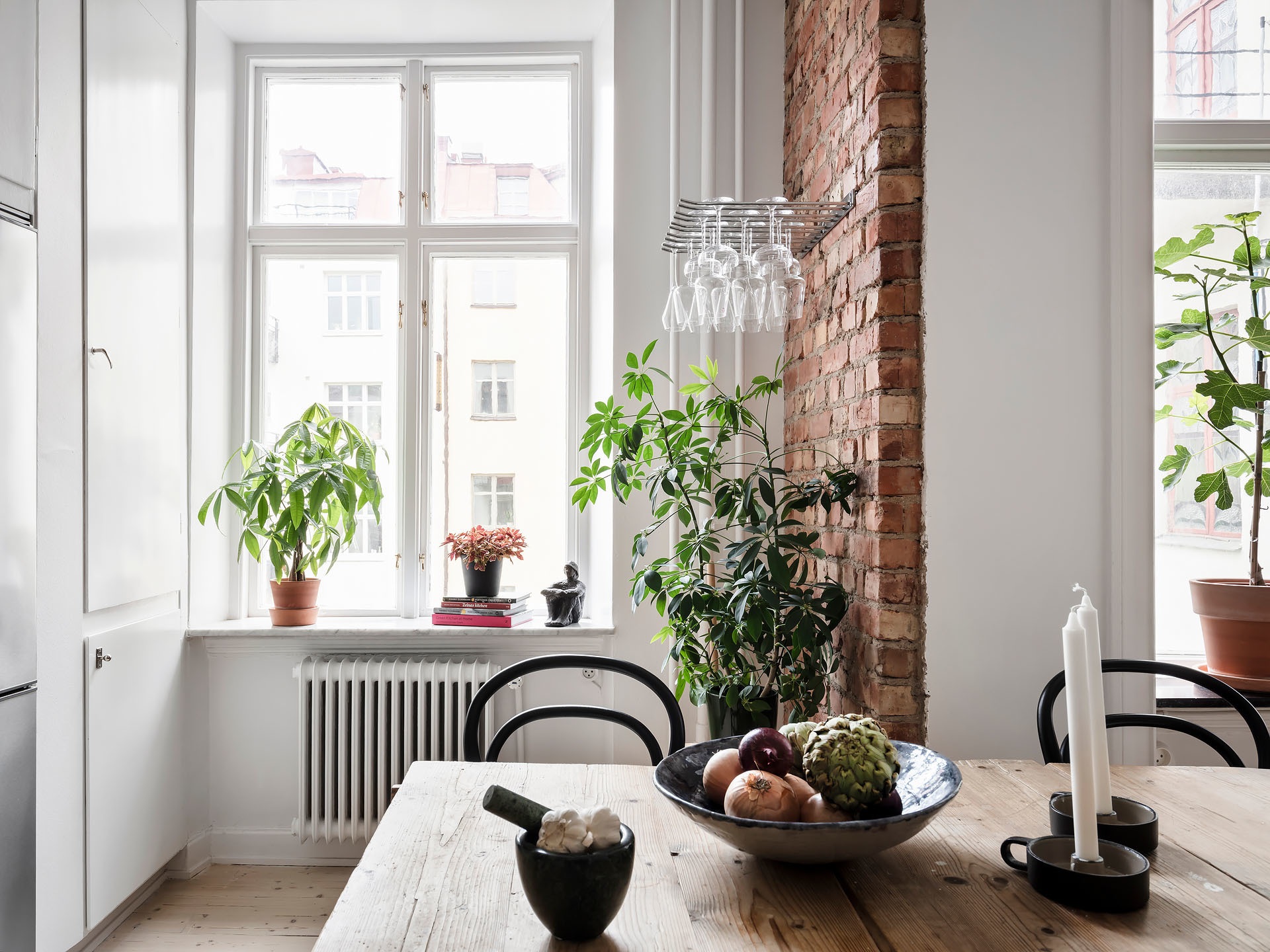 Ez a 37 m²-es stúdiólakás meglepő elrendezéssel rendelkezik. Az előszoba közvetlenül a tágas konyhába vezet, amely egyben étkezőként is funkcionál, innen pedig a nappaliba léphetünk, ami hálószobaként is szolgál. A helyiségek egyenlő méretűek, ami minden bizonnyal az épület 20. század eleji korának köszönhető, amikor még kevés figyelmet fordítottak a kis lakások négyzetmétereinek praktikus kihasználására. A lakást szépen felújították, és megőriztek benne néhány különleges elemet, amelyek kiemelik a tömegből. Patinás téglafalak, régi ablakok, elegáns díszlécek és rozetták, valamint magas belmagasság teszik egyedivé. A lakás dekorációja klasszikus skandináv stílusban készült, ami tökéletesen illik a régi terekhez, és könnyedséget kölcsönöz neki.