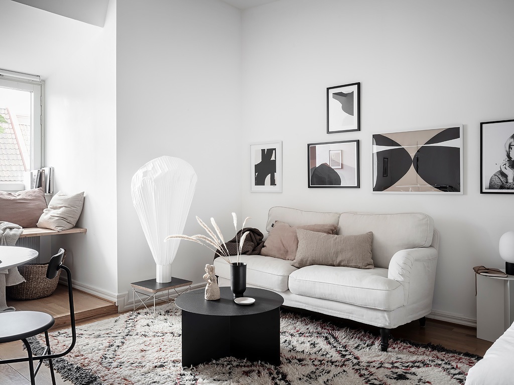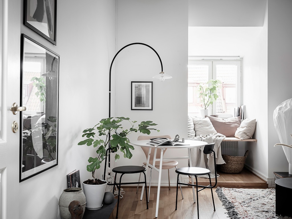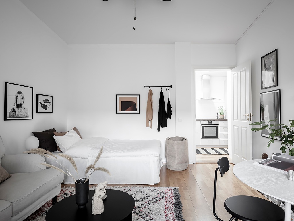 Egy régi téglaépület padlásterében alakították ki ezt a 31 m²-es fehér stúdiólakást, amelyet visszafogott skandináv stílusban rendeztek be. A fő helyiséget egy klasszikus ablak, míg a konyhát – amely az előtérben kapott helyet – egy tetőablak világítja meg. Minden négyzetmétert gondosan kihasználtak például a nappali ablaka elé egy padot alakítottak ki, ami ideális kuckó olvasáshoz, bámészkodáshoz vagy plusz ülőhelyként is szolgálhat a vendégeknek. Rengeteg tárolóhelyet is elrejtettek a különböző helyiségekben, hiszen, mint tudjuk, egy kis lakásban elengedhetetlen a rendezettség, hogy az ember elméje tiszta és nyugodt maradhasson. Az enteriőr nagy részén használt fehéret világos árnyalatok, például bézs színek, valamint fekete akcentusok teszik élénkebbé.