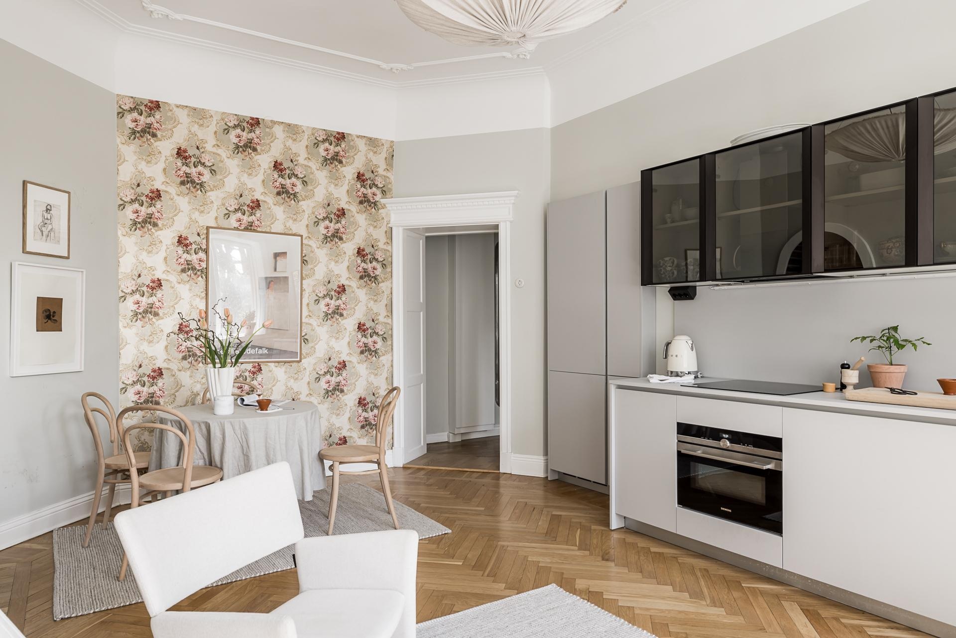 Bár otthonunk belső terein szinte bármit alakíthatunk, az épület külső megjelenésén keveset változtathatunk. A következő ingatlan egy 1913-ban épült, kastélyra emlékeztető, régi téglaházban található. A jellegzetes 3,4 méteres belmagasság tágas érzetet ad a térnek, amit a nagy, déli fekvésű ablakokon beáramló fény még tovább fokoz.Az egyszobás lakás egy nappalit foglal magában, amelyhez az olasz Poliform márkájú nyitott konyha kapcsolódik, valamint egy kényelmes hálószobát és egy fürdőszobát. A felújítás során megőrizték az eredeti réz kilincseket, a bakelit kapcsolókat, a halszálkamintás parkettát, a stukkódíszeket, a rozettaelemeket és a klasszikus díszléceket. A berendezést skandináv stílusra hangolták, amelyet vintage elemekkel egészítettek ki. Az étkező virágmintás tapétája különösen figyelemre méltó.