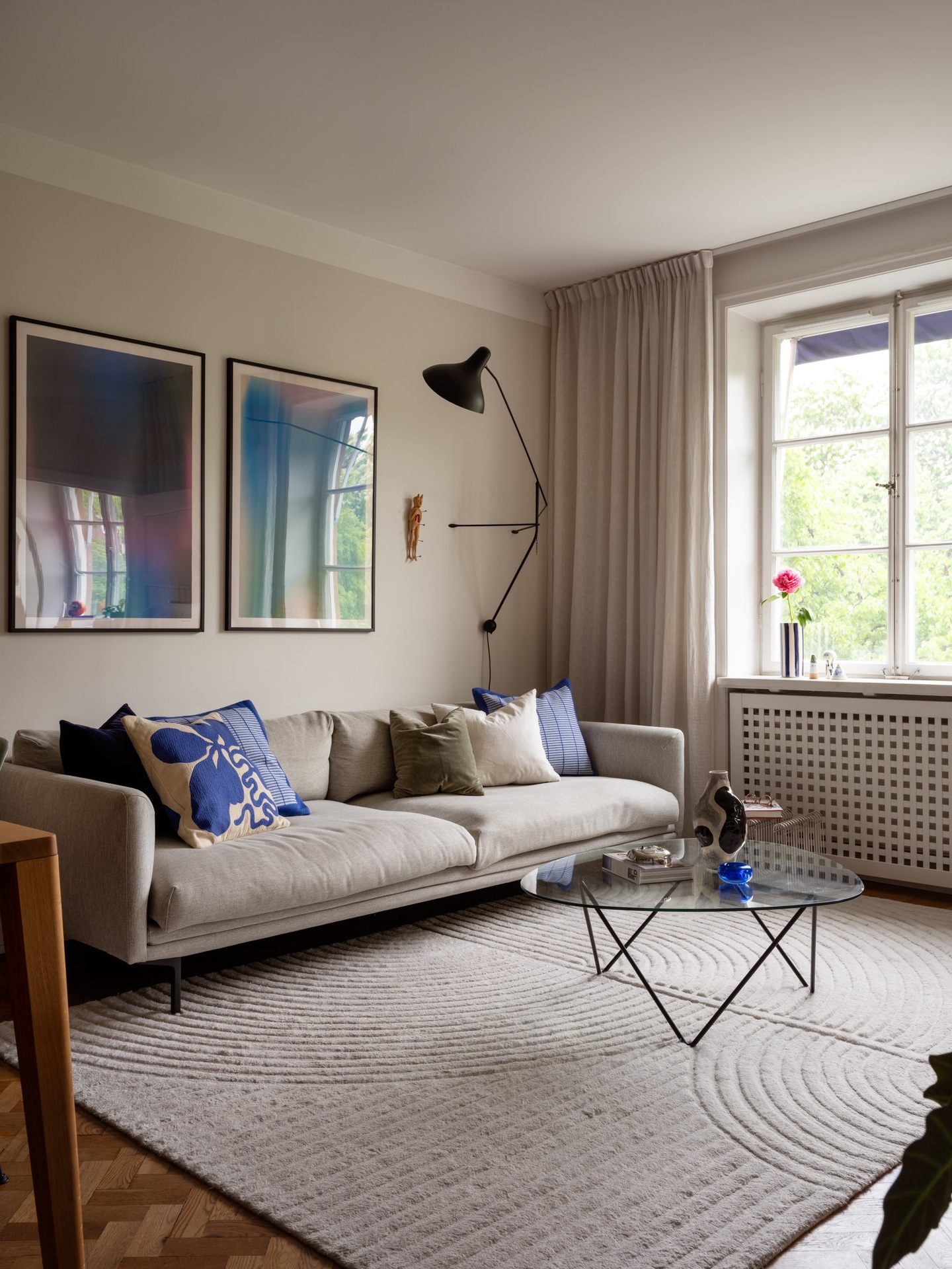 Egy 1920-as évekbeli épületében található ez a 43 m²-es, egy hálószobás lakás, amely a korszak történelmi karakterét ötvözi a kifinomult részletekkel. A mélyen ülő ablakokon beáradó fény a halszálkás parkettán ragyog, míg a magas mennyezetek tágasságot sugallnak. A korábbi előszobából praktikus konyha lett, így a nappaliban elég hely jutott egy étkezőnek és egy stílusosan kialakított dolgozóegységnek is. Az 50–60-as évek hangulatát idéző berendezéshez fehér konyhabútor és márványhatású munkalap társul, kék színfoltokkal.