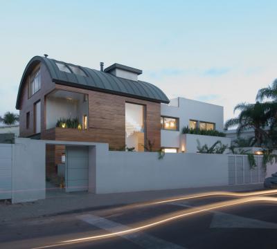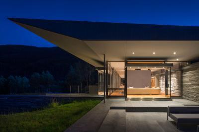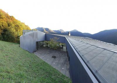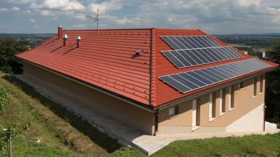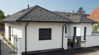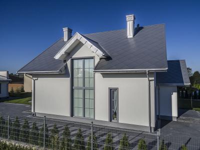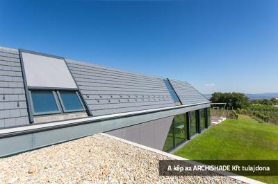 Cserepeslemez tető és sok üvegfelület a homlokzaton